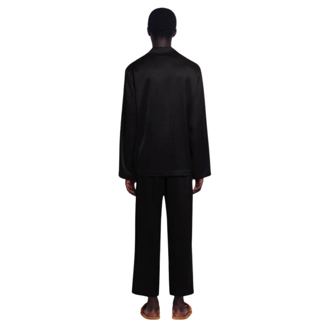 The glossy black slip-satin fabric not only provides a contemporary refresh but also adds a luxurious feel to the Jelmer shirt. Satin is known for its smooth, lustrous surface and its ability to drape beautifully, creating a flattering and elegant silhouette. This fabric choice ensures that the shirt feels as good as it looks, offering a comfortable and indulgent wearing experience.