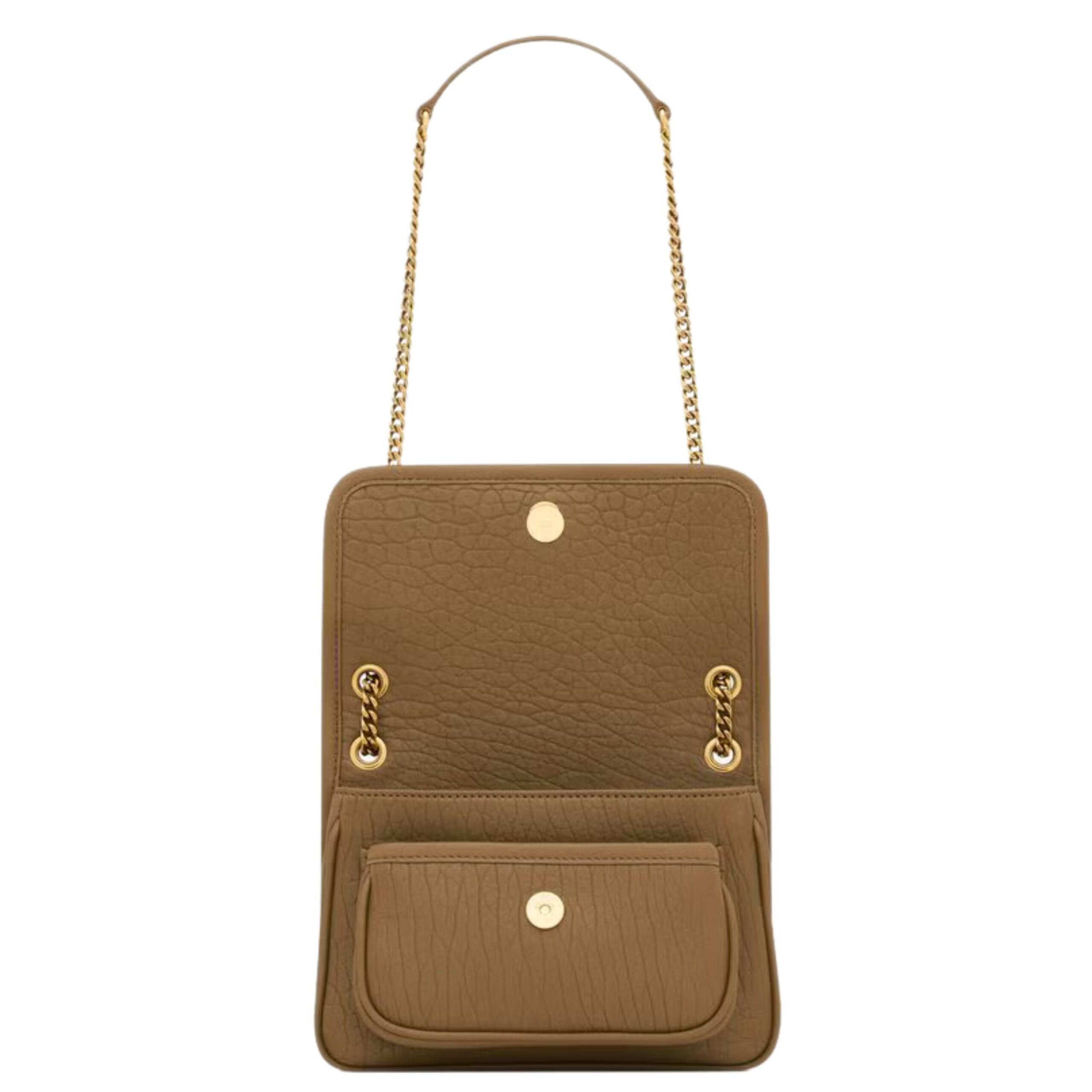 Despite its small size, the Niki Mini offers just enough space to carry your essentials—ideal for day-to-night transitions. It features a front flap with a magnetic snap closure, leading to a well-organized interior with a main compartment, an open pocket, and a convenient zipped pocket to keep your valuables secure. The tonal YSL monogram on the flap enhances the bag’s understated yet unmistakable branding.