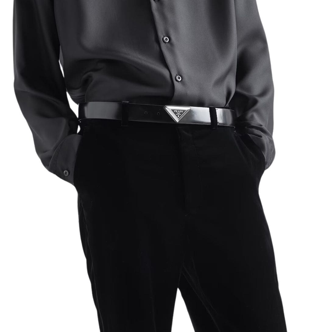 At first glance, the belt captivates with its minimalist yet sophisticated design. The supple brushed leather exudes a subtle sheen, adding depth and richness to its texture. Prada’s choice of premium leather ensures not only durability but also a luxurious feel against the skin, making it a pleasure to wear.
