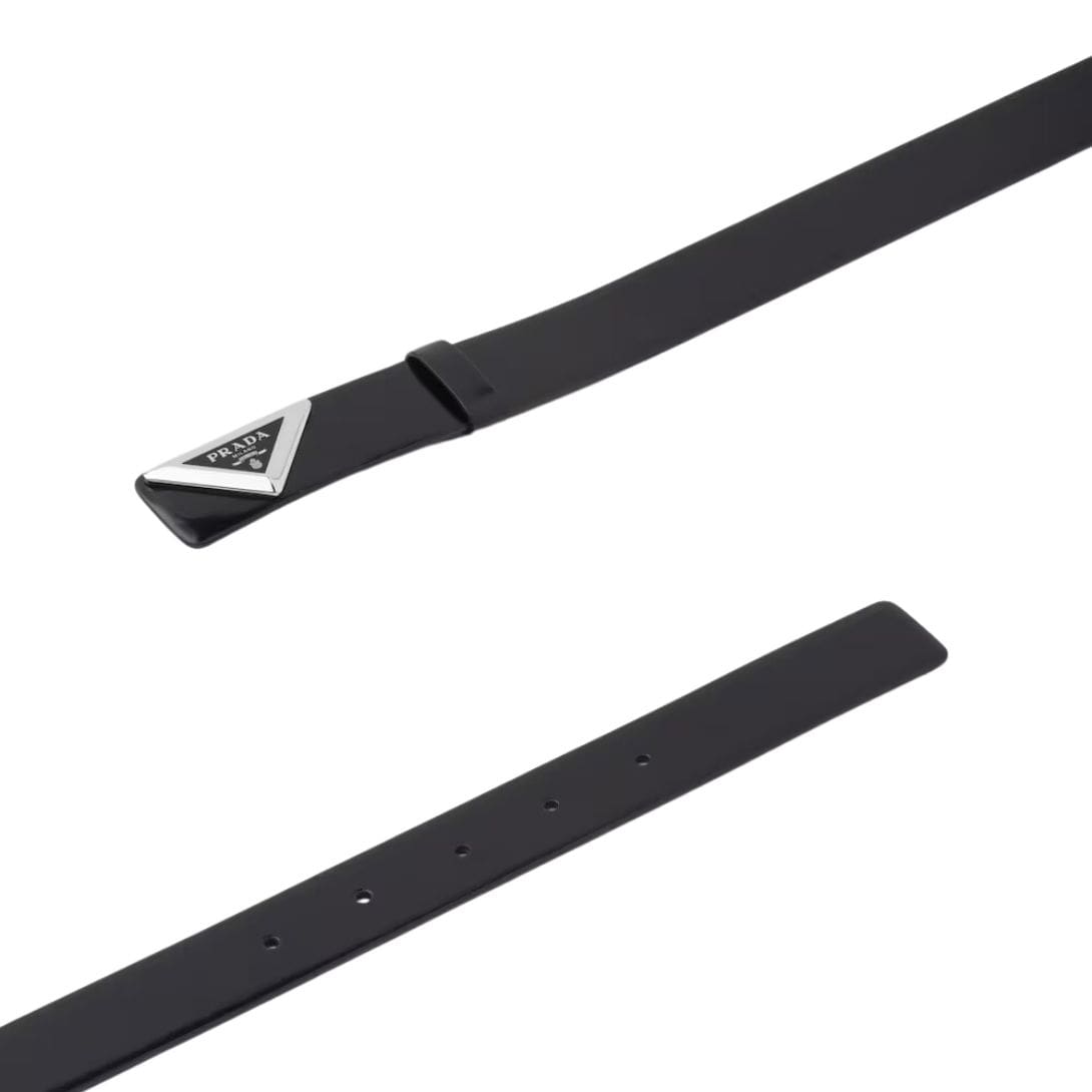 The belt features a sleek, rectangular buckle crafted from high-quality metal, showcasing Prada’s iconic logo discreetly engraved for a touch of brand recognition. The polished finish of the buckle contrasts elegantly with the matte surface of the leather, creating a harmonious balance of textures.