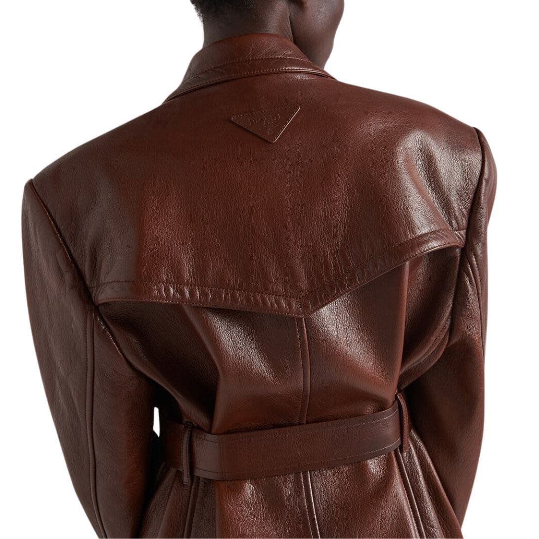 Attention to detail is evident in every aspect of the jacket’s construction. Intricately stitched seams and precision-cut panels showcase Prada’s impeccable craftsmanship, ensuring a flawless finish that stands the test of time. The rich, buttery texture of the leather not only feels indulgently soft against the skin but also adds a luxurious dimension to the garment, elevating its overall aesthetic.