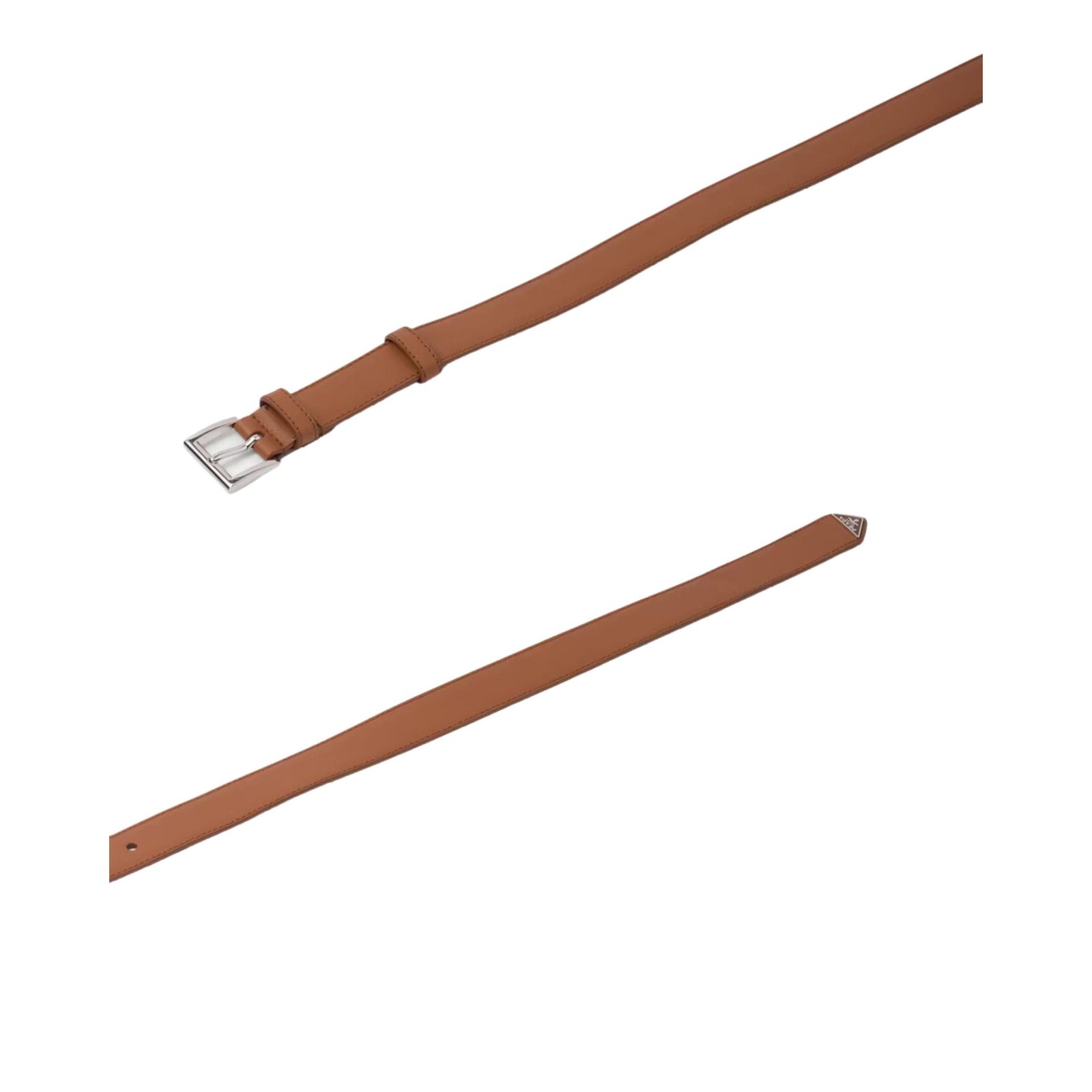 This luxurious Prada Leather Belt In Brown epitomizes refined, minimalist elegance, with its defining feature being the iconic enameled-metal triangle logo adorning its tip.