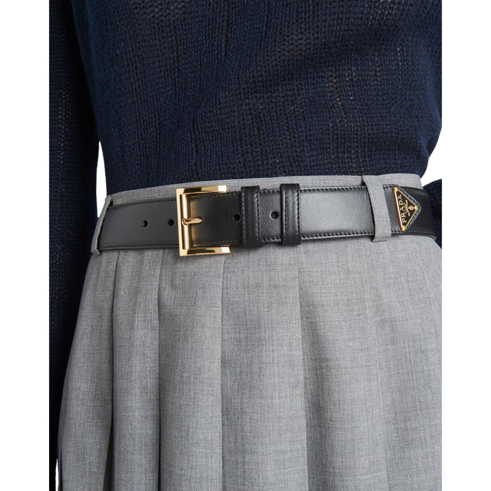 The enameled-metal triangle logo, a symbol of the brand’s heritage and timeless style, elevates the belt from a mere accessory to a statement of elegance. Its presence on the belt’s tip adds a touch of distinction, drawing attention to the meticulous detailing and craftsmanship that define this piece.