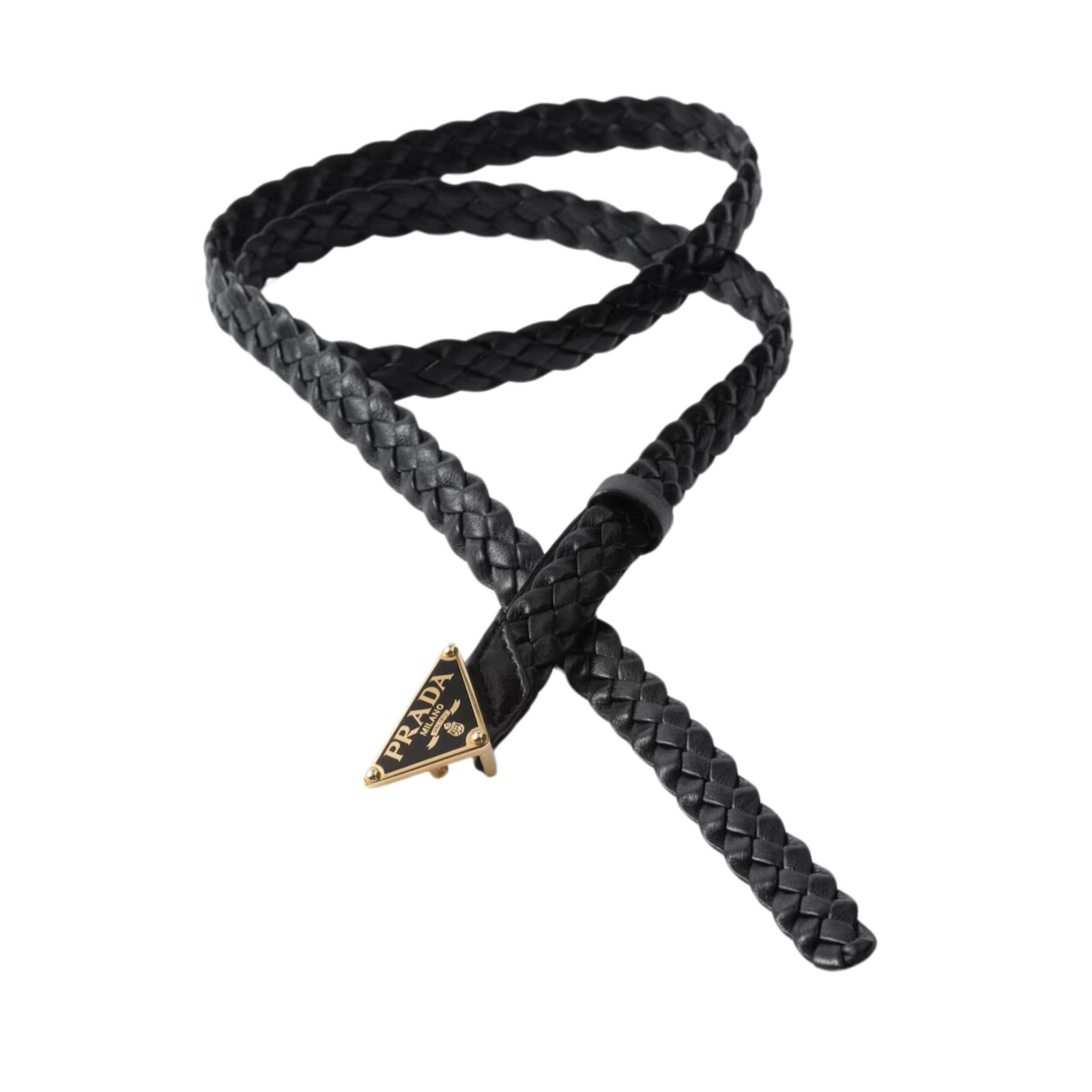 Experience the epitome of refined elegance with our narrow Prada Nappa Leather Belt In Black, seamlessly blending casual charm with sophisticated craftsmanship. Its understated allure is elevated by intricate braided detailing, adding a touch of artisanal finesse to any ensemble.
