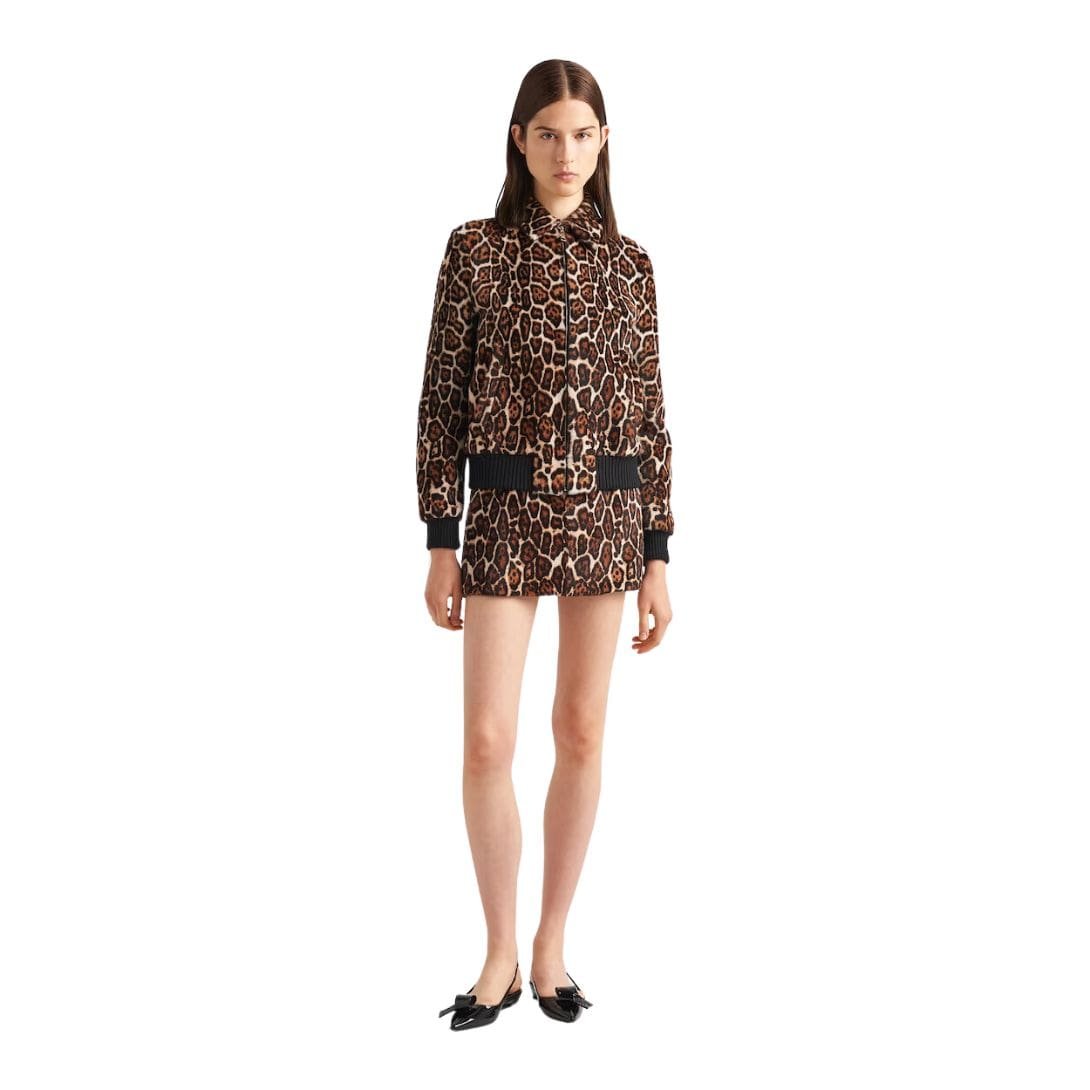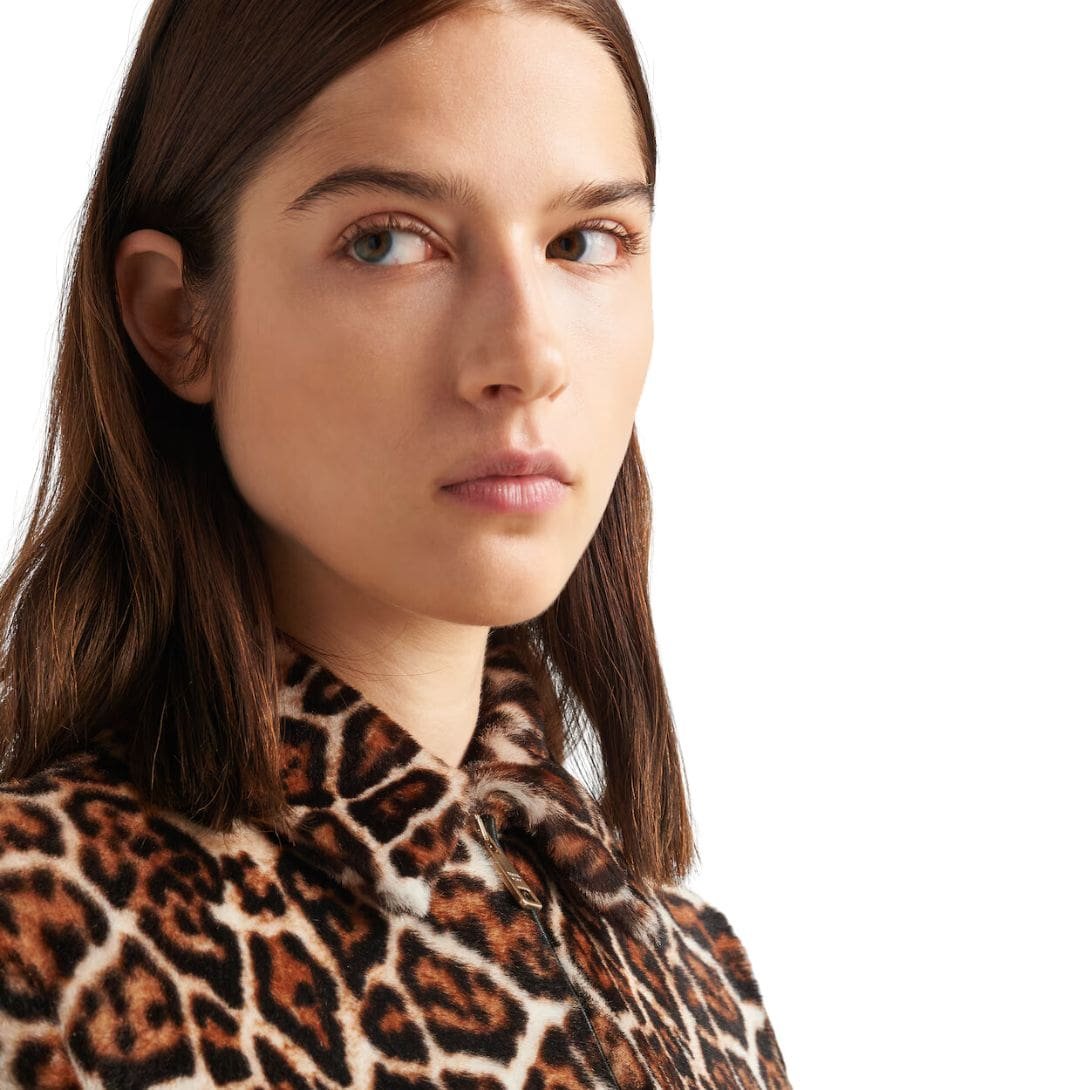 The PRADA Printed Shearling Bomber Jacket is a masterful blend of luxury, style, and functionality, epitomizing Prada’s commitment to exceptional craftsmanship and innovative design. This jacket stands out with its striking printed shearling exterior, showcasing a unique, eye-catching pattern that is both contemporary and sophisticated. The print, a testament to Prada’s avant-garde approach, adds a bold visual appeal, making it a statement piece in any wardrobe.PRADA PRINTED SHEARLING BOMBER JACKET