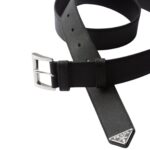 The belt features a sleek, minimalist design that seamlessly blends functionality with elegance. The signature Prada logo, either embossed or displayed on a polished metal buckle, adds a touch of refinement and instantly recognizable branding. Available in a range of classic colors such as black, brown, and navy, the belt complements a variety of outfits, from formal suits to casual ensembles, making it a versatile addition to any wardrobe.