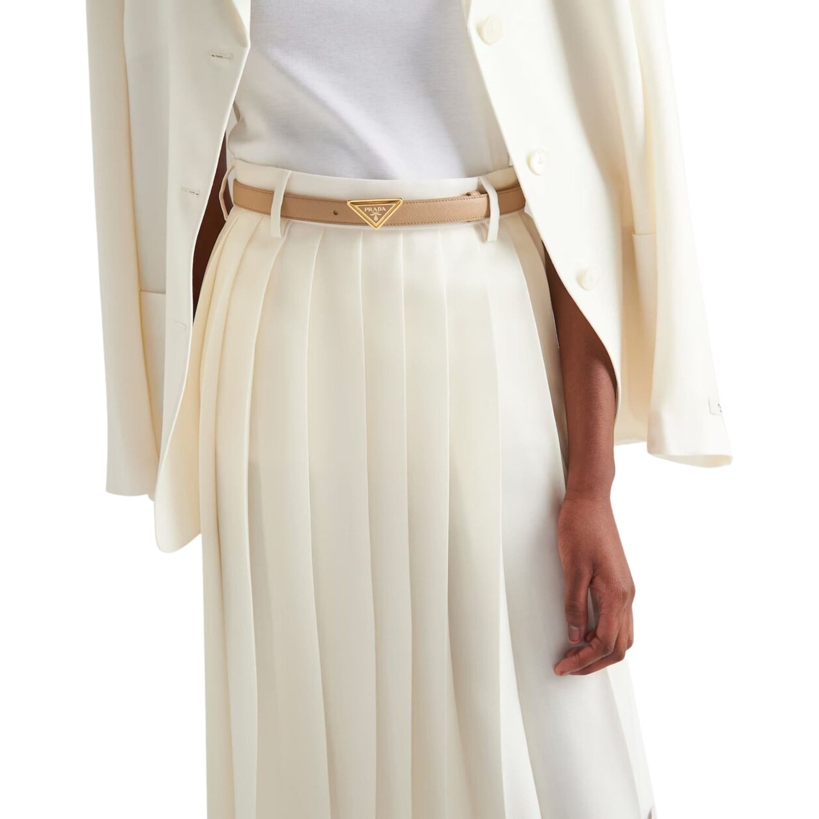At the heart of the design lies the metal buckle, meticulously crafted and embellished with the enameled logo. This detail not only adds a touch of refinement but also serves as a testament to Prada’s unwavering commitment to excellence and innovation.