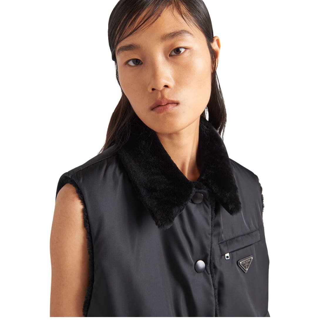 The design of the vest is both timeless and contemporary, making it a versatile addition to any wardrobe. Its minimalist silhouette ensures versatility, allowing it to seamlessly transition from casual outings to more formal occasions. Whether layered over a crisp button-down shirt for a polished look or paired with a basic tee for a laid-back vibe, the Prada Shearling Vest effortlessly elevates any outfit.