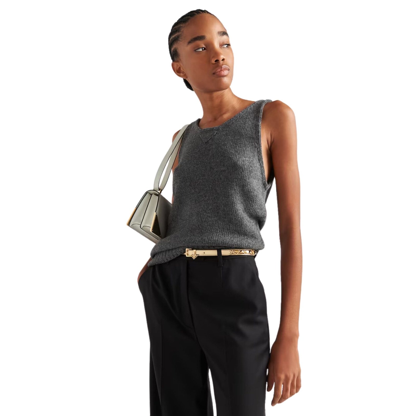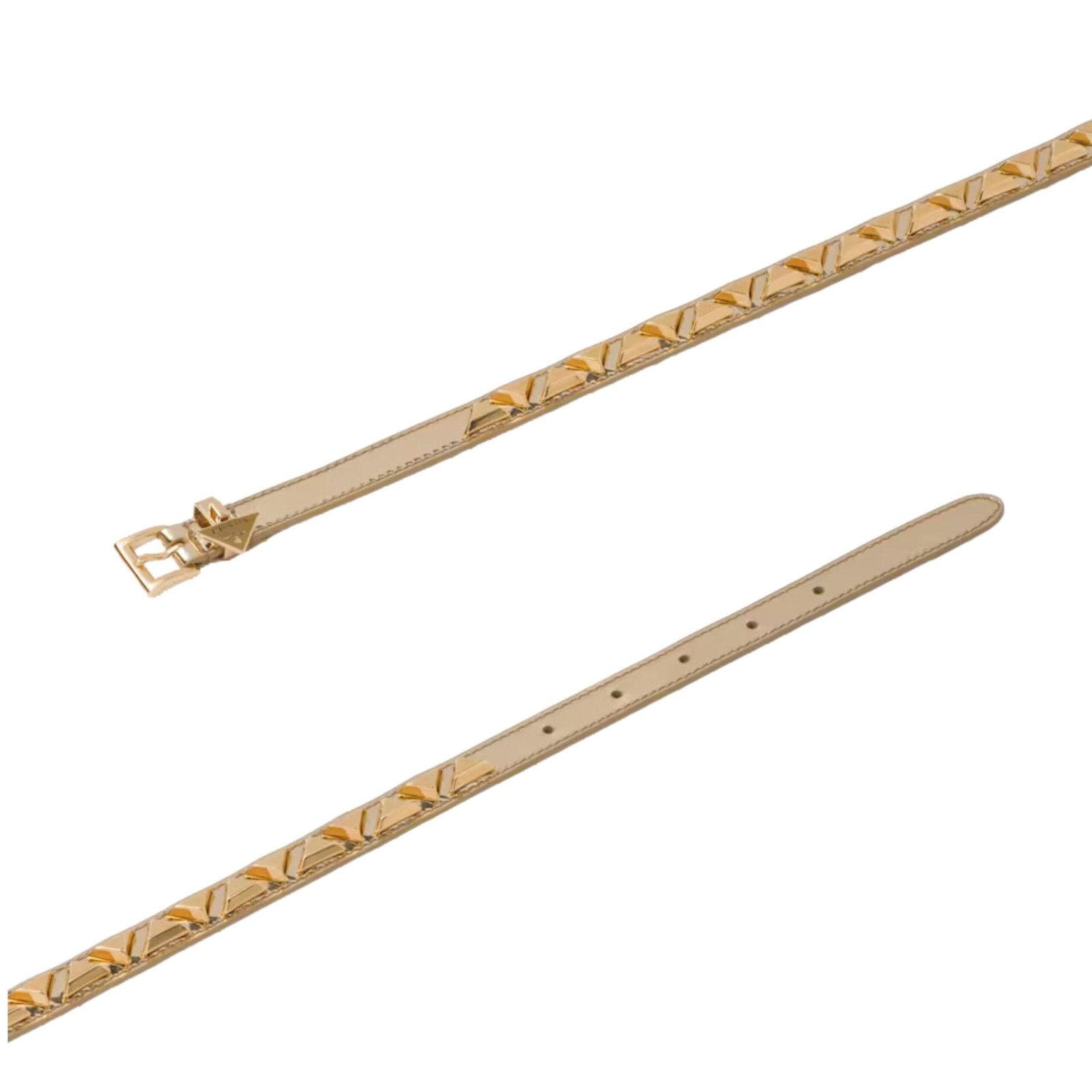 At its core lies the metal buckle, seamlessly blending functionality with style, while the belt loop featuring the enameled metal triangle logo charm serves as a subtle yet striking accent, reflecting the brand’s iconic heritage.