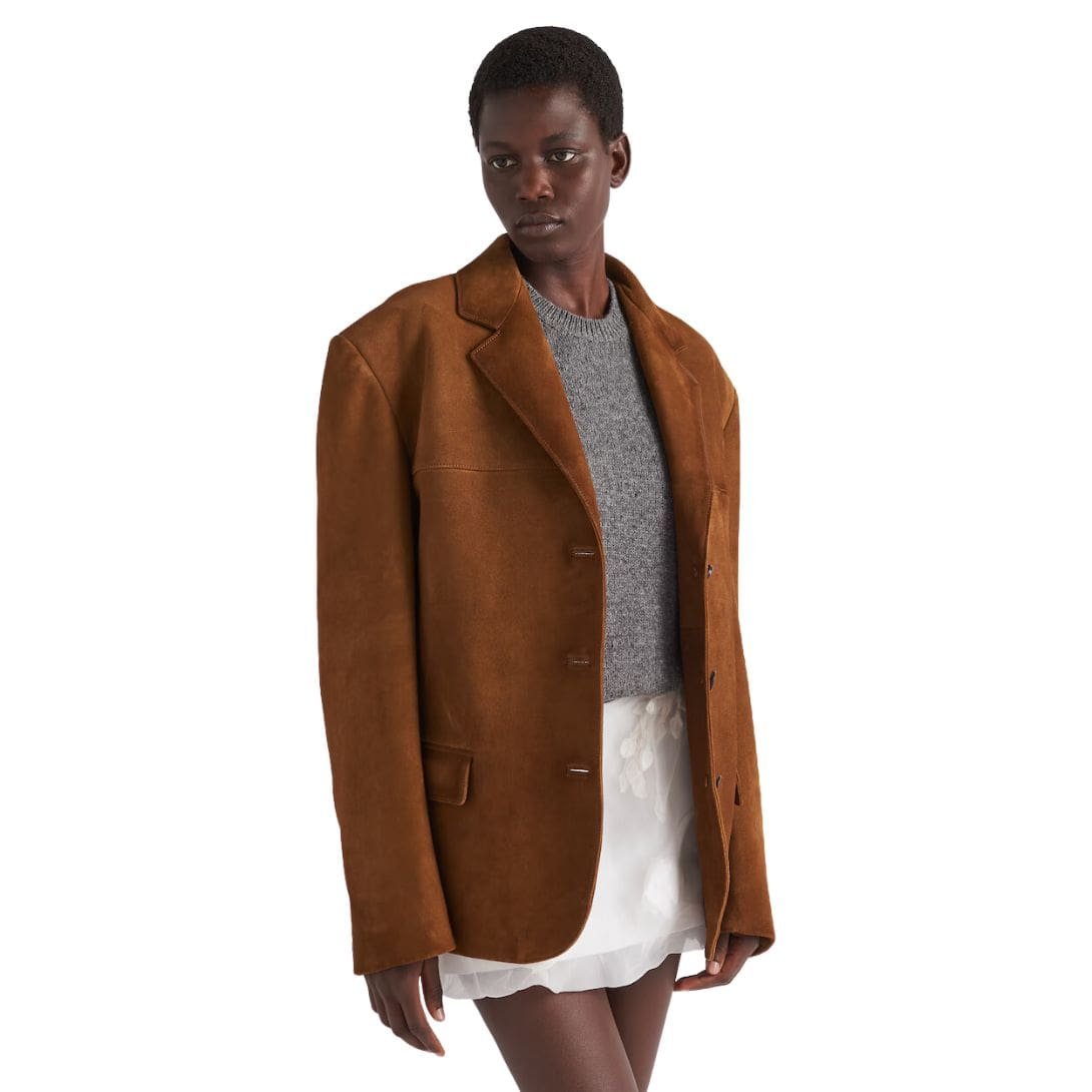 Beyond its aesthetic appeal, the Prada Suede Jacket also offers practical features designed for modern life. Thoughtfully placed pockets provide convenience without compromising the jacket’s sleek silhouette, while a smooth lining ensures easy layering and comfort.