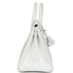 This exquisite Birkin bag is crafted in White Epsom leather with gold hardware, featuring tonal stitching, a front flap with two straps and a toggle closure, a clochette with a lock and two keys, and double rolled handles for effortless elegance.