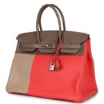 This exquisite tri-color Cascade Birkin features a stunning combination of Rose Jaipur Clemence leather, Etoupe, and Argile Swift leather, with brushed palladium hardware for a sophisticated and modern touch. The bag is elegantly designed with tonal stitching, a front flap, and two straps with a center toggle closure. It also includes a clochette with lock and two keys, along with double rolled handles for comfortable carrying.