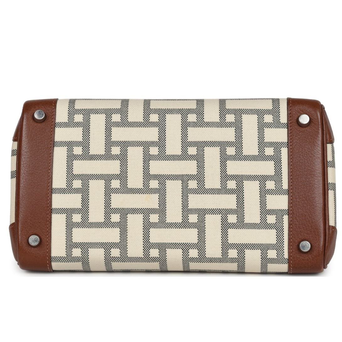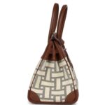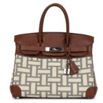 This limited-edition Hermès Birkin showcases a striking combination of Marron D’Inde buffalo leather and mosaique toile canvas, accented by palladium hardware. The bag features tonal stitching, buffalo leather trim, a distinctive mosaic canvas design, a front flap, two straps with a center toggle closure, a clochette with a lock and two keys, and double rolled handles for classic elegance and functionality.