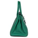 This Birkin is crafted from Vert Vertigo clemence leather with palladium hardware, featuring tonal stitching, two straps with a front toggle closure, and a clochette with lock and two keys. The bag also has double rolled handles, adding to its elegant and refined aesthetic.