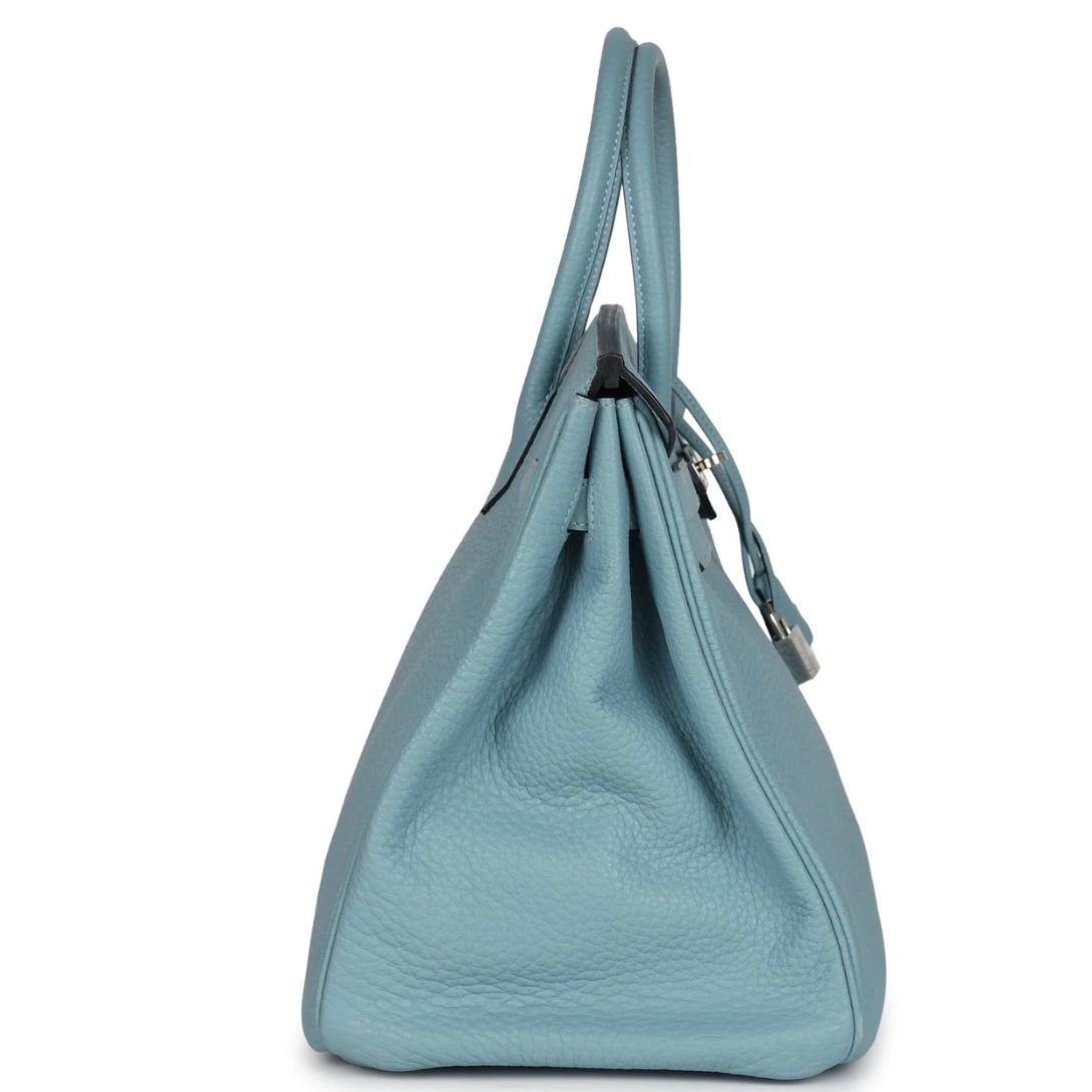 This Hermès Birkin is beautifully rendered in Ciel Togo leather with palladium hardware. It features tonal stitching, a front flap with two straps, a center toggle closure, a clochette with a lock and two keys, and double rolled handles, combining timeless elegance with practicality.