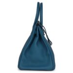 This Pre-owned Birkin in Cobalt togo leather with palladium hardware is in excellent condition with only slight wear, particularly to the hardware and bottom corners. It’s a sophisticated and durable bag that retains its shape, making it a desirable and practical investment.