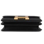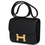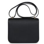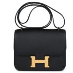 The Hermès Constance in Black Epsom leather with gold hardware is a timeless classic. Its elegant design features tonal stitching, a signature metal “H” snap-lock closure, and an adjustable shoulder strap, perfect for day-to-night versatility.