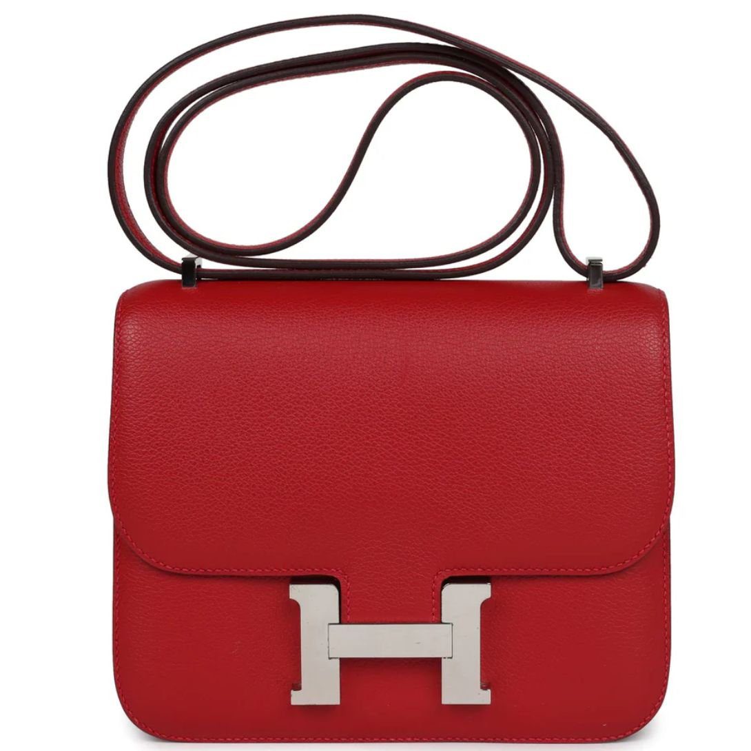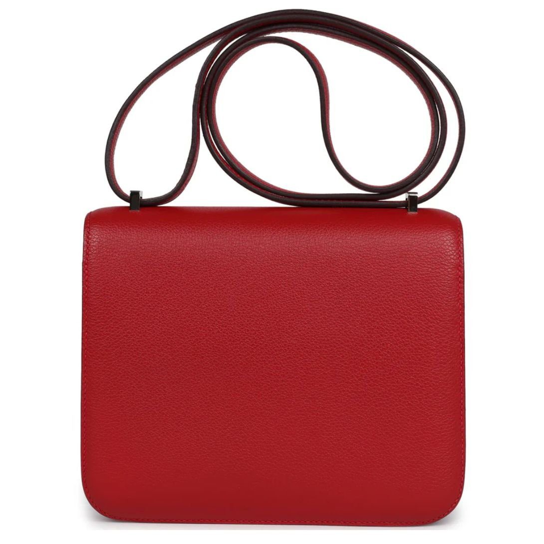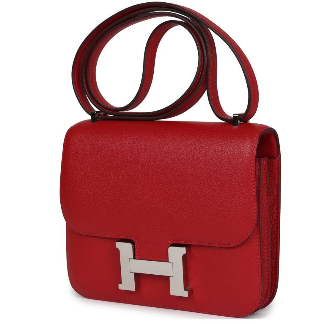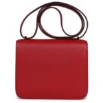 This elegant Hermès Constance is made from luxurious Rouge Casaque Evercolor leather with palladium hardware. It features tonal stitching, a signature metal “H” snap lock closure, and an adjustable shoulder strap for versatile wear.
