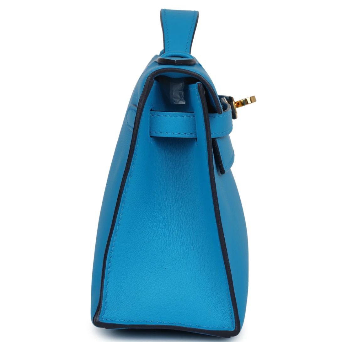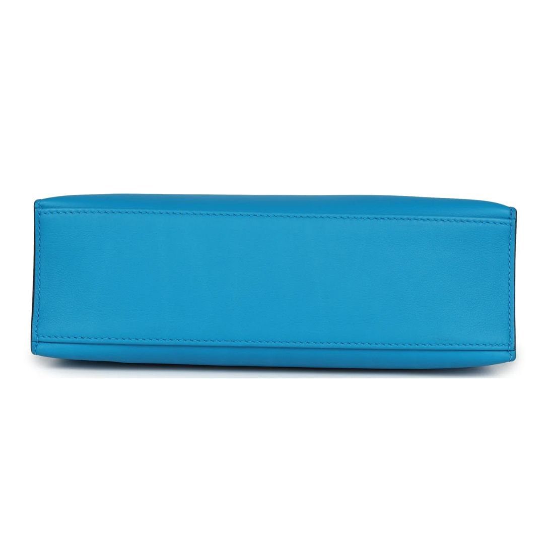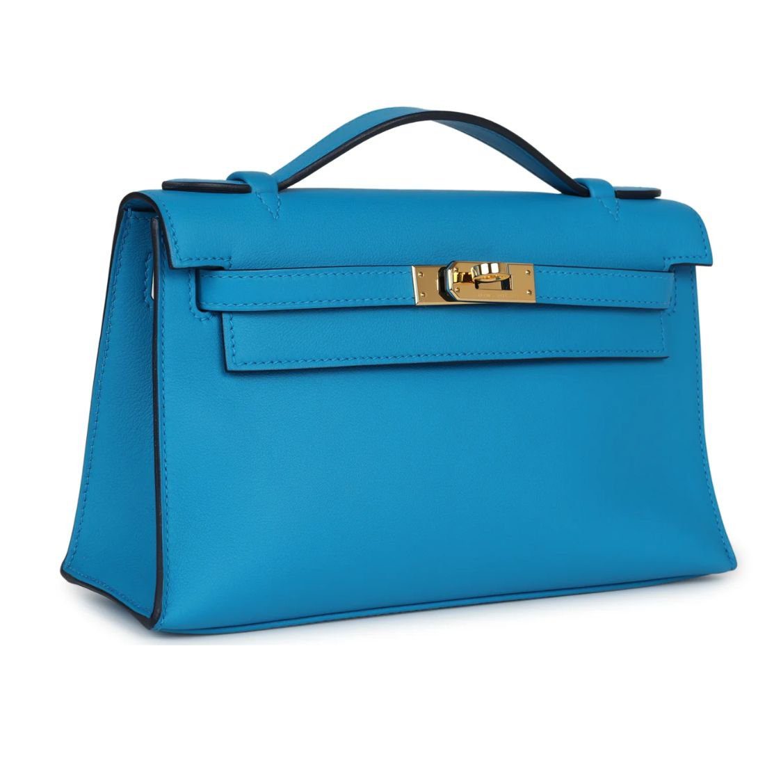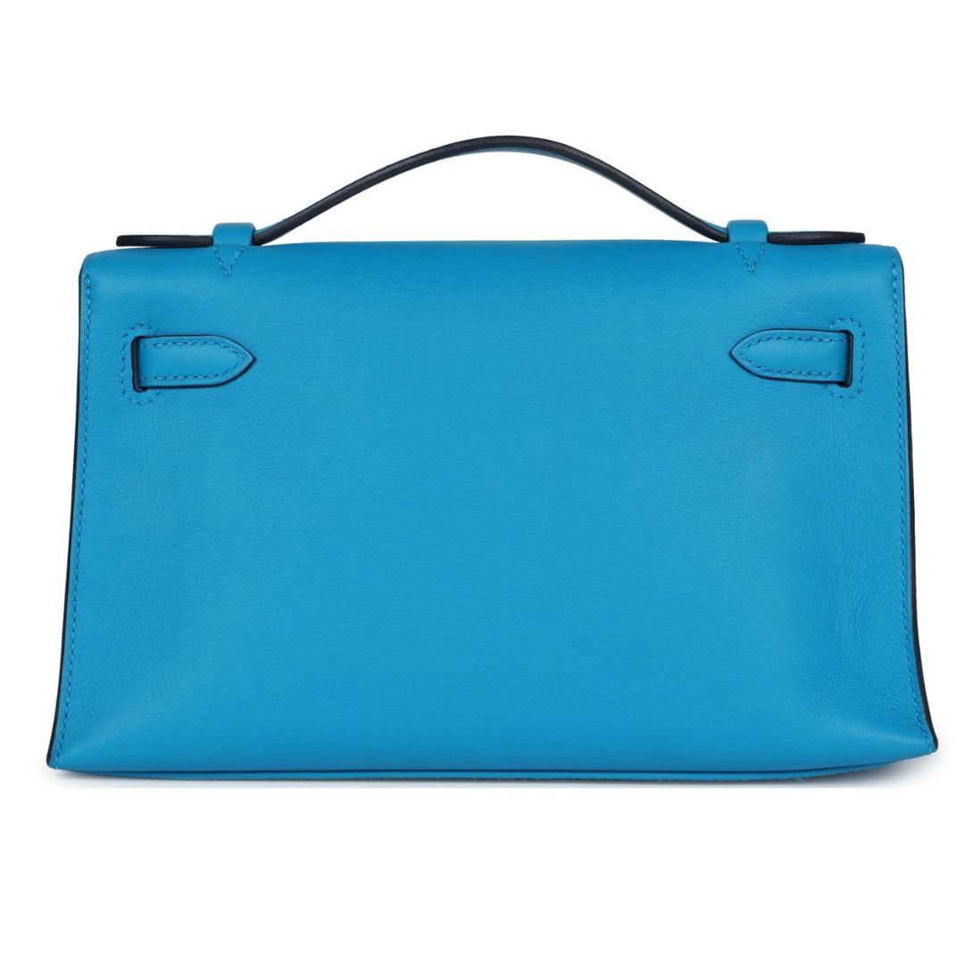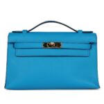 The Kelly Pochette in Bleu Frida swift leather with gold hardware is a chic and compact Hermès design. It features tonal stitching, a front flap with two straps, a center toggle closure, and a top flat handle.