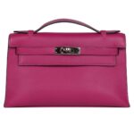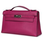 This stunning Kelly Pochette by Hermès is crafted from soft Rose Pourpre Swift leather and features elegant palladium hardware. The design includes tonal stitching, a front flap, and two straps with a center toggle closure, along with a top flat handle for added versatility.