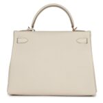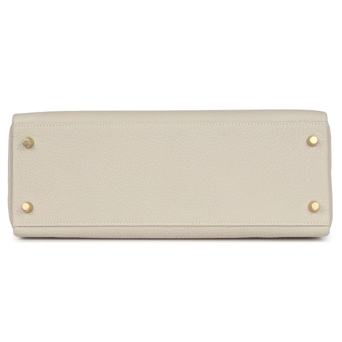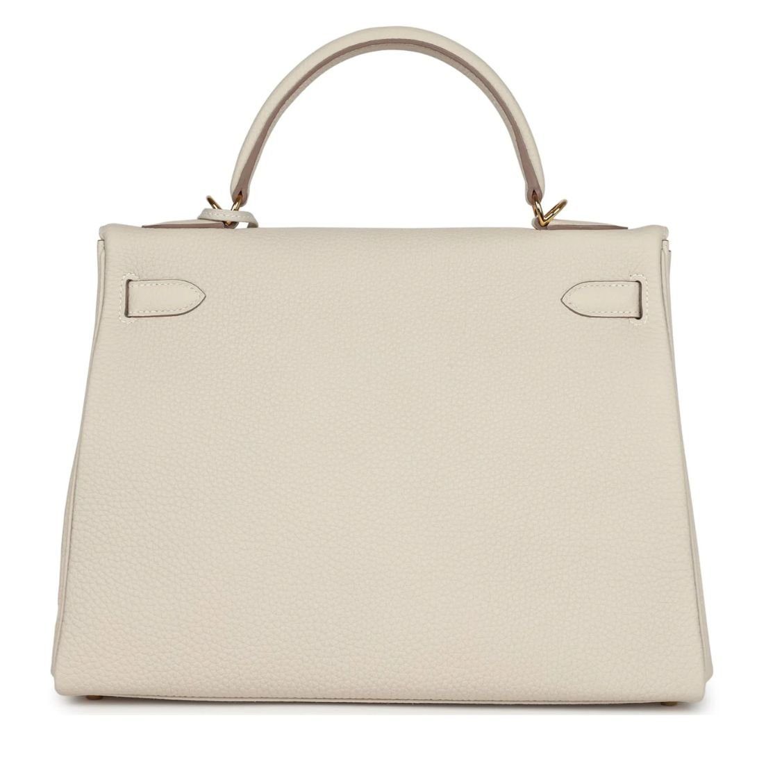 This Kelly, crafted in the Retourne style, is made from Craie Togo leather with gold hardware. It features tonal stitching, a front toggle closure, a clochette with lock and two keys, a single rolled handle, and a removable shoulder strap, offering both functionality and sophistication.