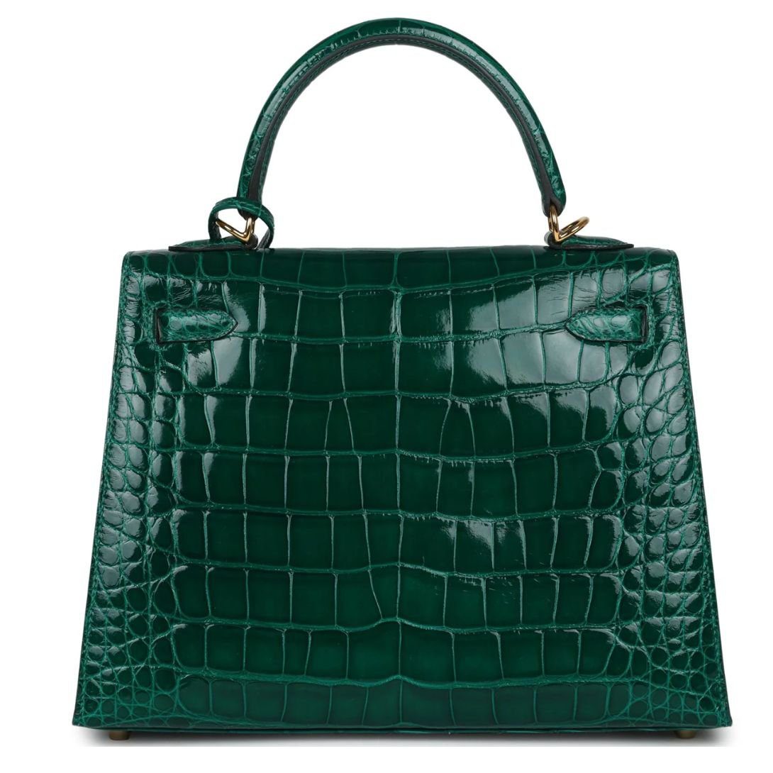 This Hermès Kelly 25, designed in the Sellier style, is crafted from Emerald shiny Mississippiensis alligator leather with gold hardware. It features tonal stitching, a front flap with two straps and a center toggle closure, a clochette with a lock and two keys, a single rolled handle, and a removable shoulder strap, exuding timeless sophistication.