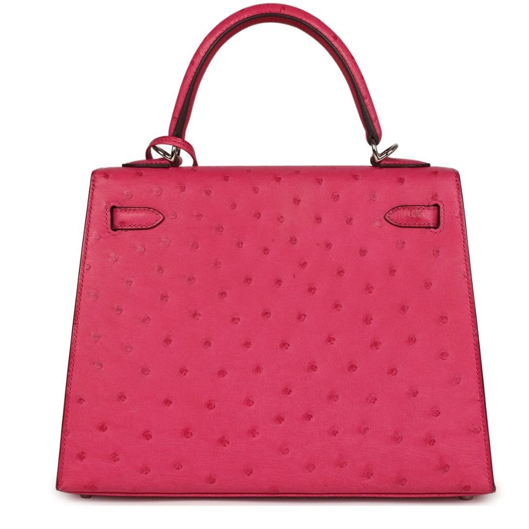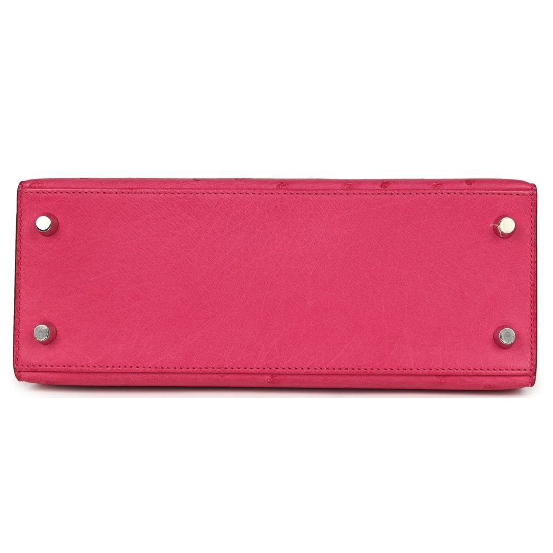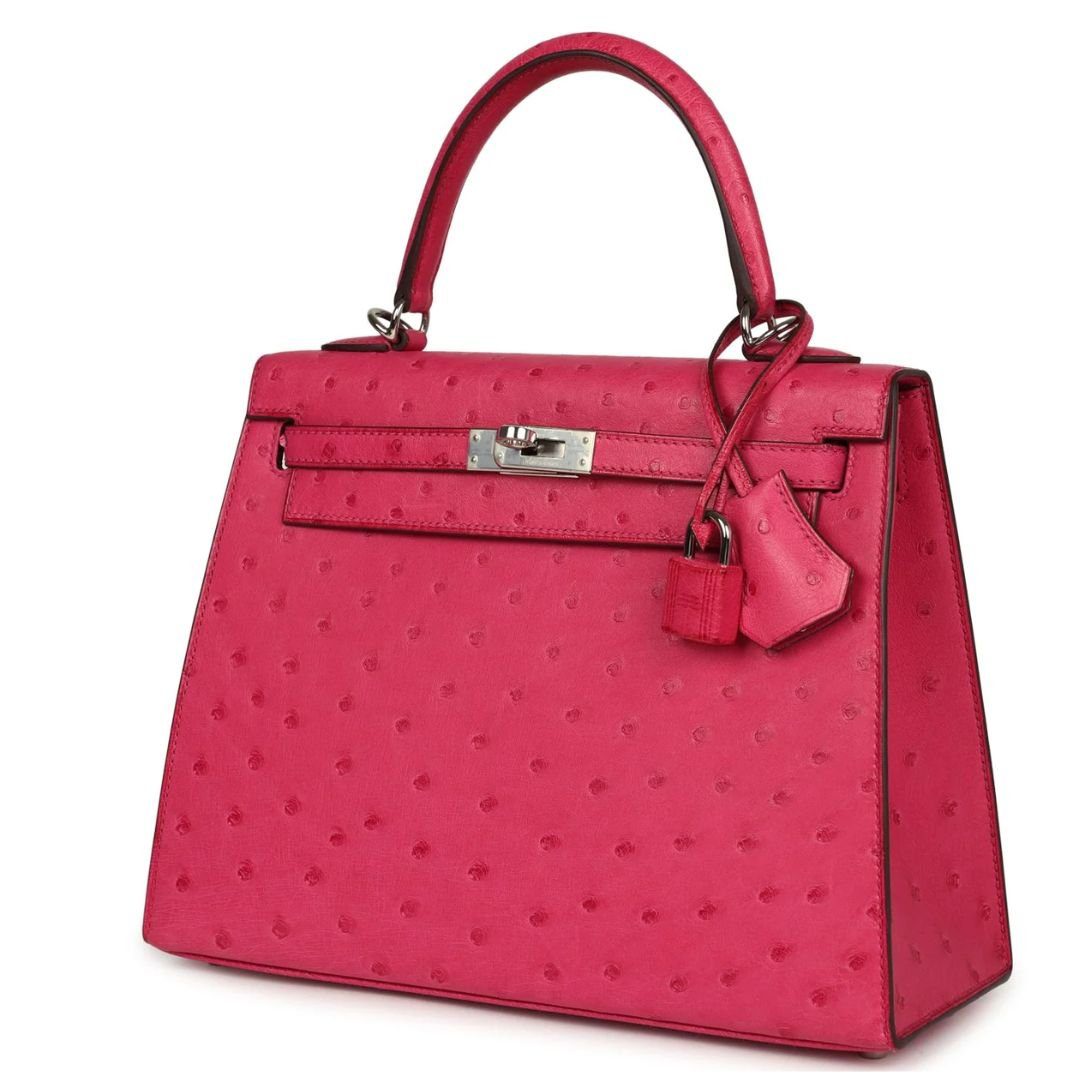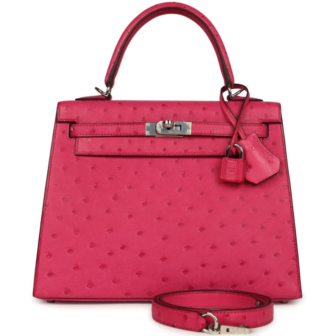 The Kelly Sellier in Rose Tyrien Ostrich offers a structured, elegant silhouette with a striking color and luxurious materials, making it a standout addition to any collection.
