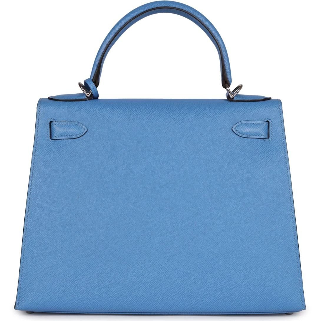 This Kelly, in the elegant Sellier style, is crafted in Bleu Azur Epsom leather with palladium hardware. Key design elements include tonal stitching, a front toggle closure, a clochette with a lock and two keys, and a single rolled handle.