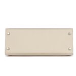 This Kelly Sellier, in Craie Epsom leather with palladium hardware, exudes elegance and sophistication. Its thoughtful design features tonal stitching, two front straps with a toggle closure, a clochette with a lock and two keys, a single rolled handle, and a removable shoulder strap.