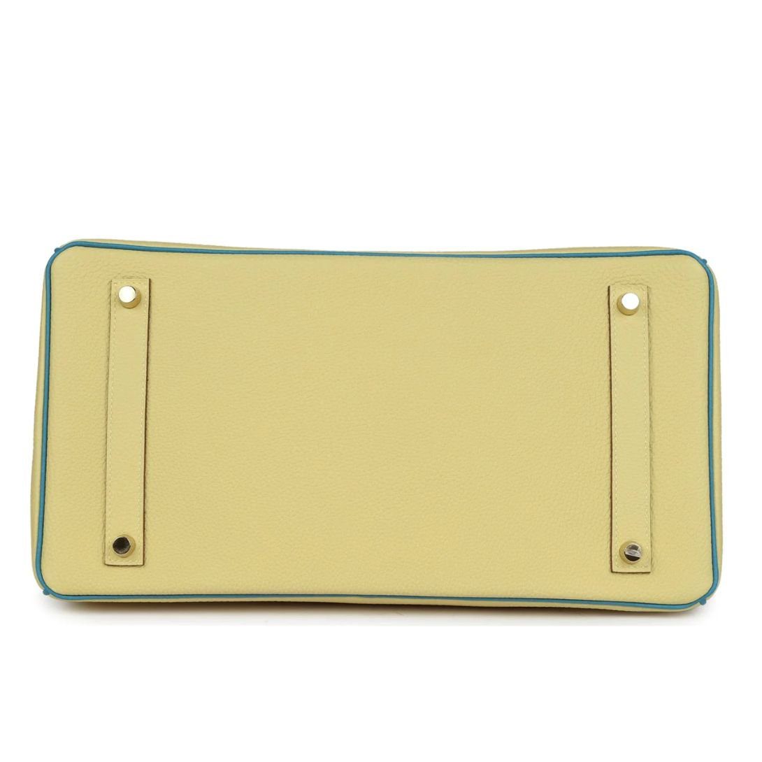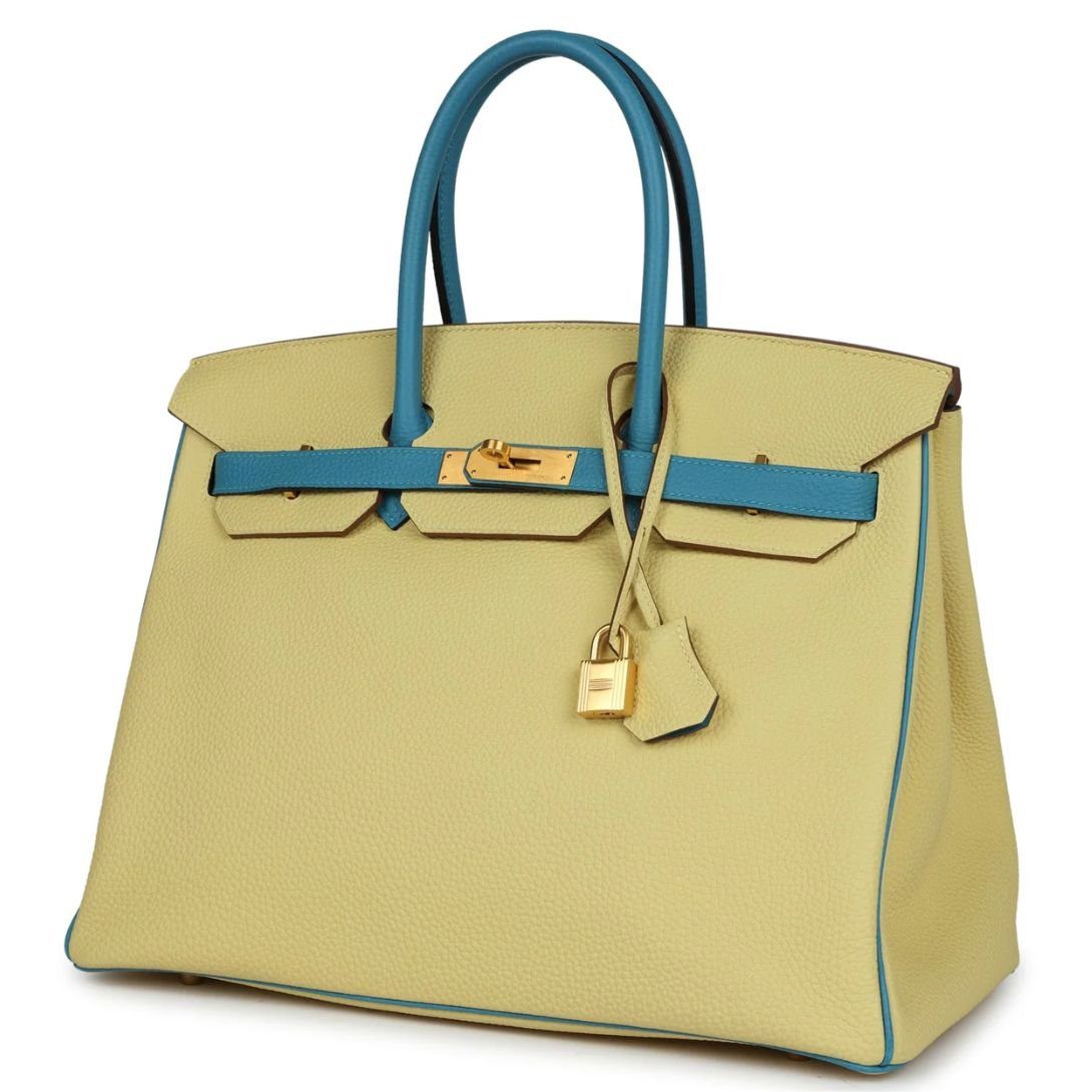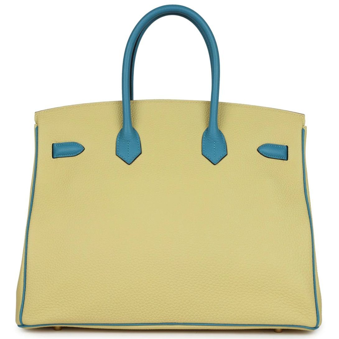 Home BAGS HERMES BAGS PRE-OWNED HERMÈS SPECIAL ORDER (HSS) BIRKIN 35 JAUNE POUSSIN AND BLEU PARADISE TOGO BRUSHED GOLD HARDWARE