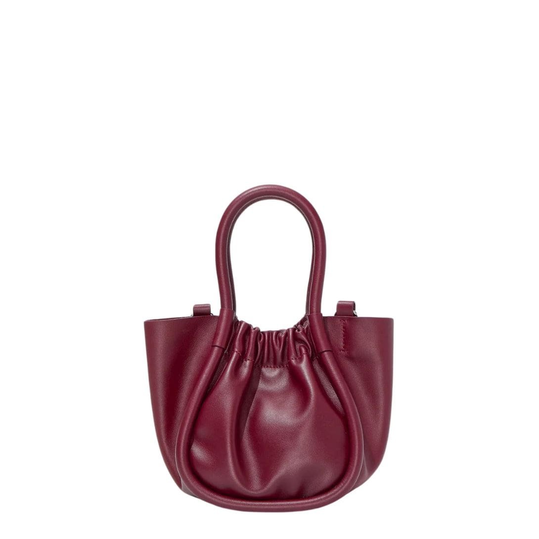 Proenza Extra Small Ruched Tote Garnet. epitomizes modern sophistication with its meticulously crafted unstructured silhouette. This miniature masterpiece showcases wide piping that elegantly ascends to form a ruched open top, creating a sculptural aesthetic that is both visually captivating and functionally efficient.