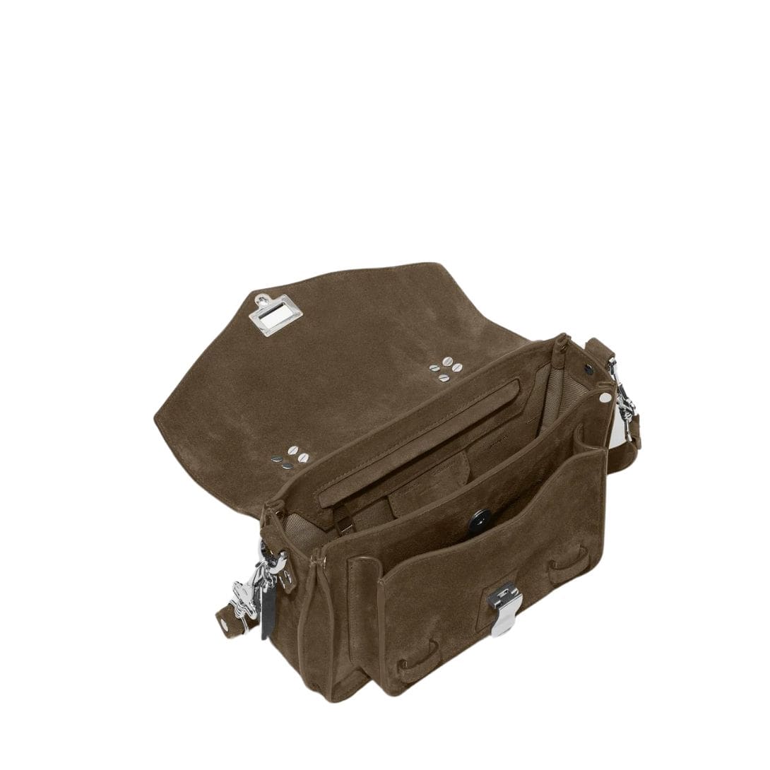 Accentuating the bag’s allure is the silver-tone metal hardware, which adds a contemporary edge and complements the rich dark brown suede with a subtle shimmer. Crafted with meticulous attention to detail, the PS1 Tiny Bag exemplifies the brand’s commitment to superior craftsmanship and quality. Made in Italy, it bears the hallmarks of Italian excellence in leather goods, promising unparalleled refinement and sophistication.