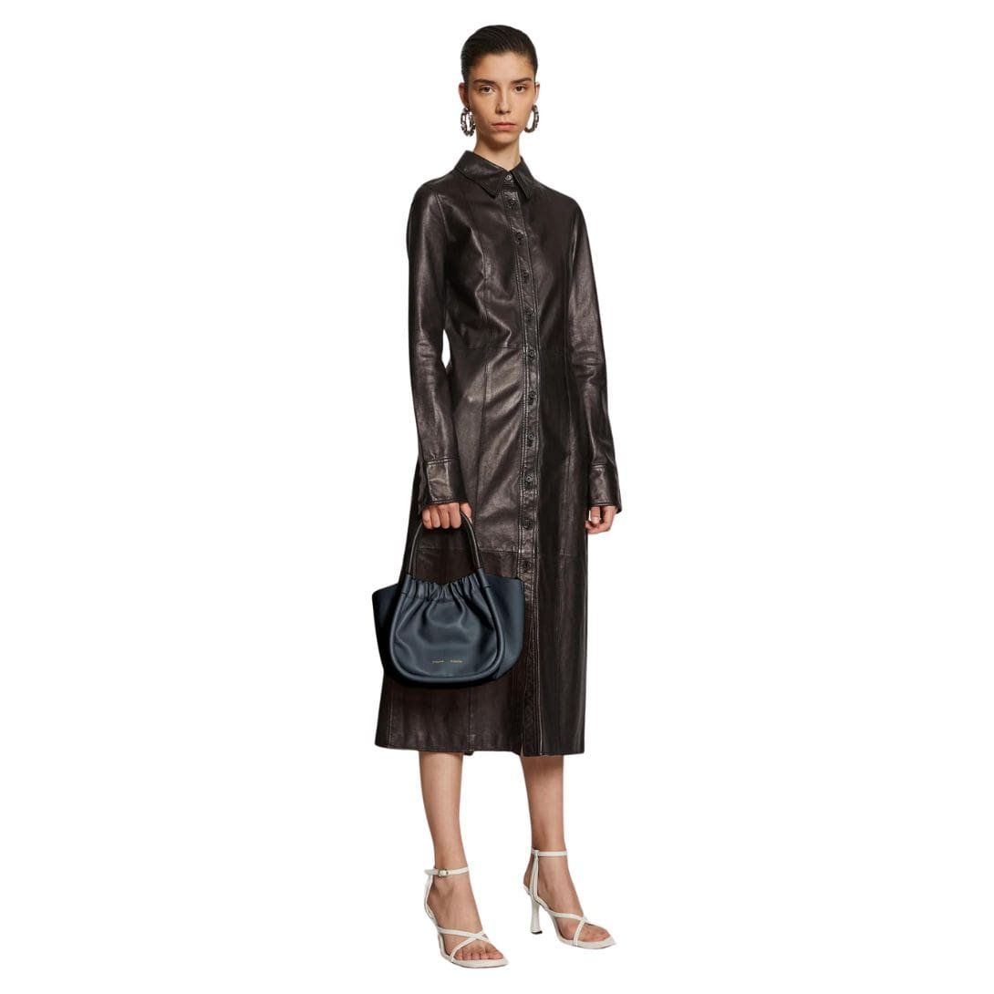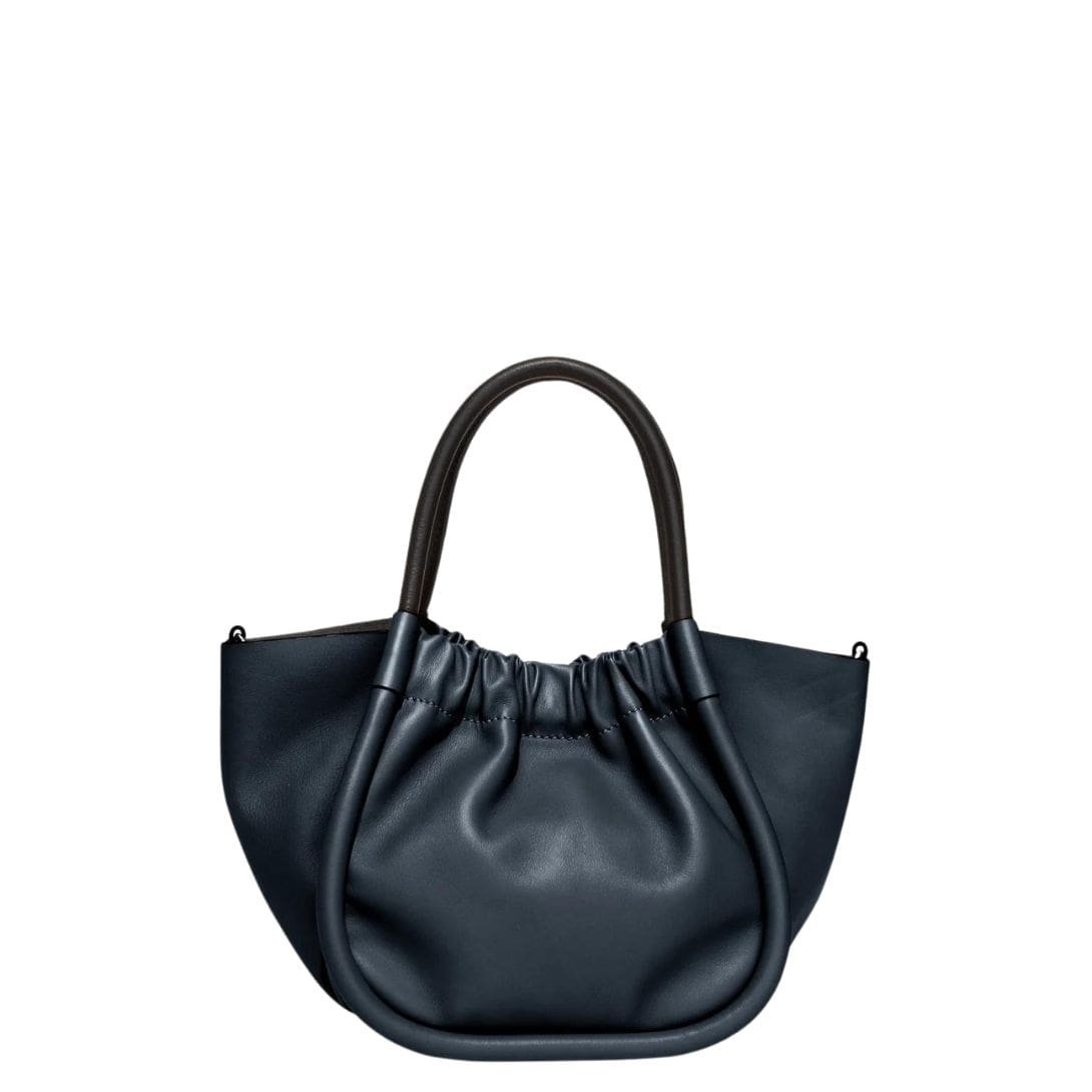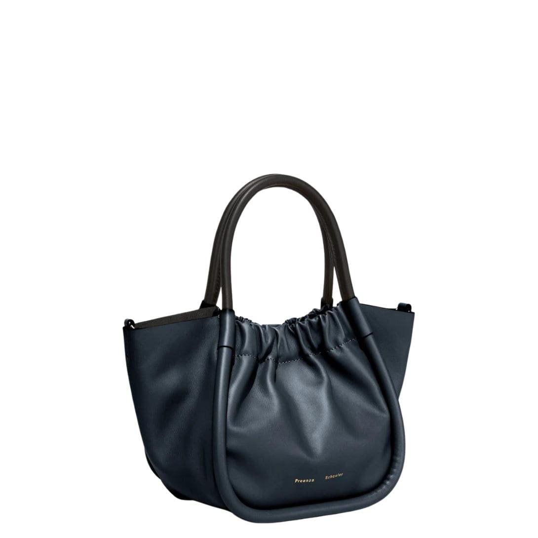 Step into elevated elegance with the Proenza Small Ruched Crossbody Tote Dark Navy, meticulously crafted to embrace an unstructured yet sculptural silhouette that seamlessly blends timeless sophistication with modern functionality. Enveloped in a rich dark navy hue, this tote exudes understated luxury, offering a versatile accessory to complement any ensemble with effortless grace.