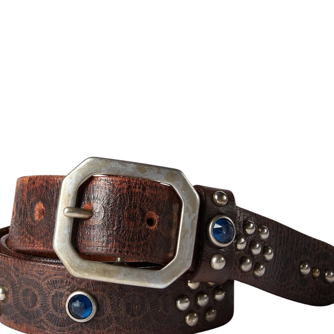 Each stud is strategically positioned along the length of the belt, creating a striking visual contrast against the smooth leather backdrop. These embellishments, meticulously crafted to perfection, elevate the belt from a mere accessory to a statement piece. The gleam of each stud catches the light, commanding attention and adding a touch of glamour to any ensemble.