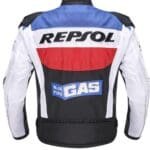 Equipped with CE-approved armor inserts on the shoulders, elbows, and back, this jacket ensures maximum safety without compromising on flexibility or comfort. Its ergonomic design and adjustable fit guarantee freedom of movement, allowing riders to tackle every twist and turn with confidence. Whether you’re tearing up the track or cruising the streets, the Repsol Blue Fire Gas Motorbike Rider’s Racing Leather Jacket is your ultimate companion, embodying the spirit of speed and adventure with every ride.