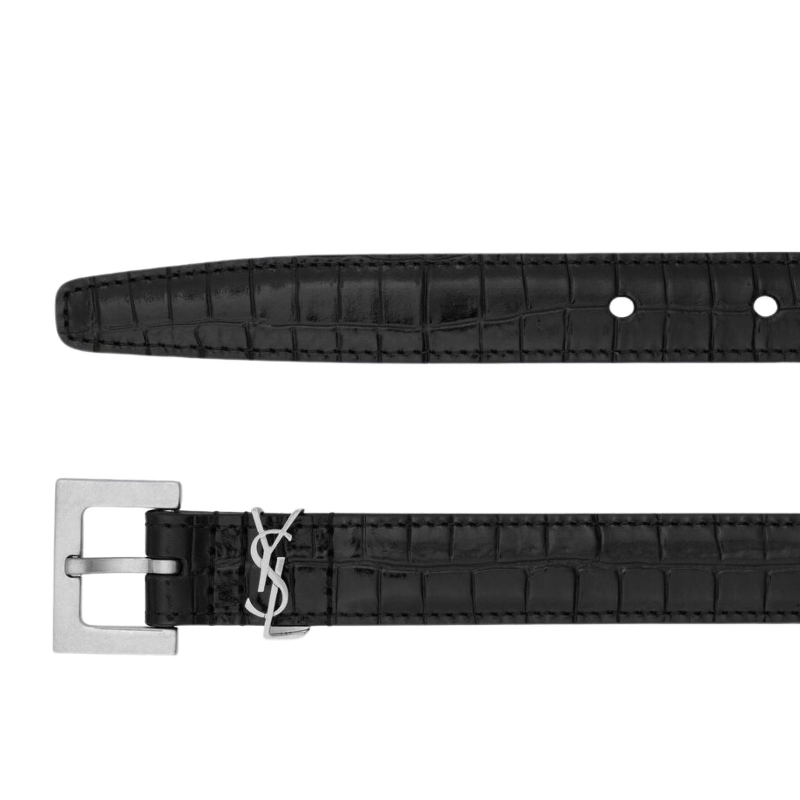 Introducing Saint Laurent Cassandre Thin Belt In Crocodile Embossed Leather, a timeless accessory that combines style and functionality. This belt features a sleek design with an adjustable square buckle and the iconic Cassandre loop, adding a touch of sophistication to any outfit.