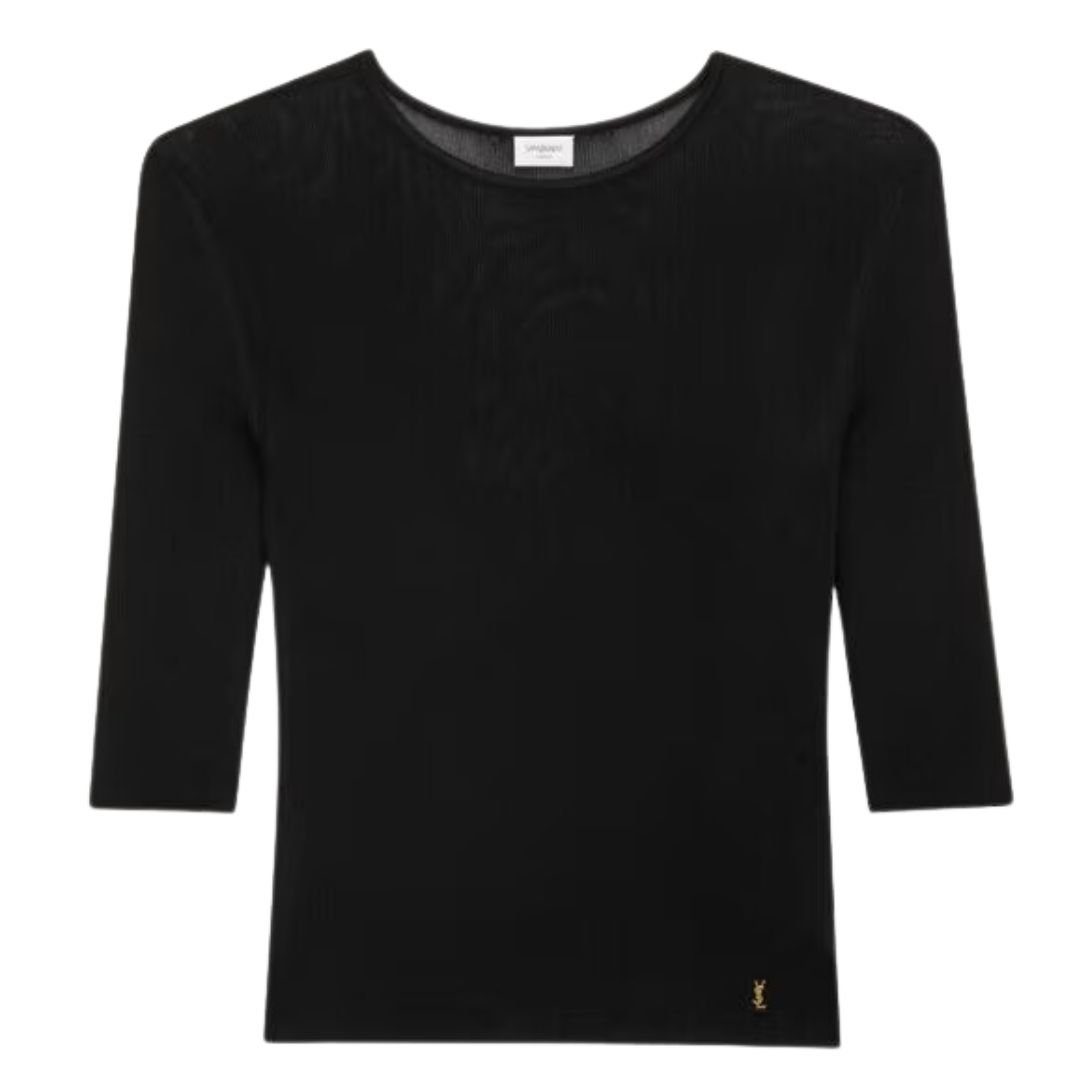 This semi-sheer Saint Laurent Cassandre Top in Knit, crafted from certified viscose, is a versatile piece that exudes elegance and modern sophistication. With a lightweight design and minimal detailing, it seamlessly complements any wardrobe.