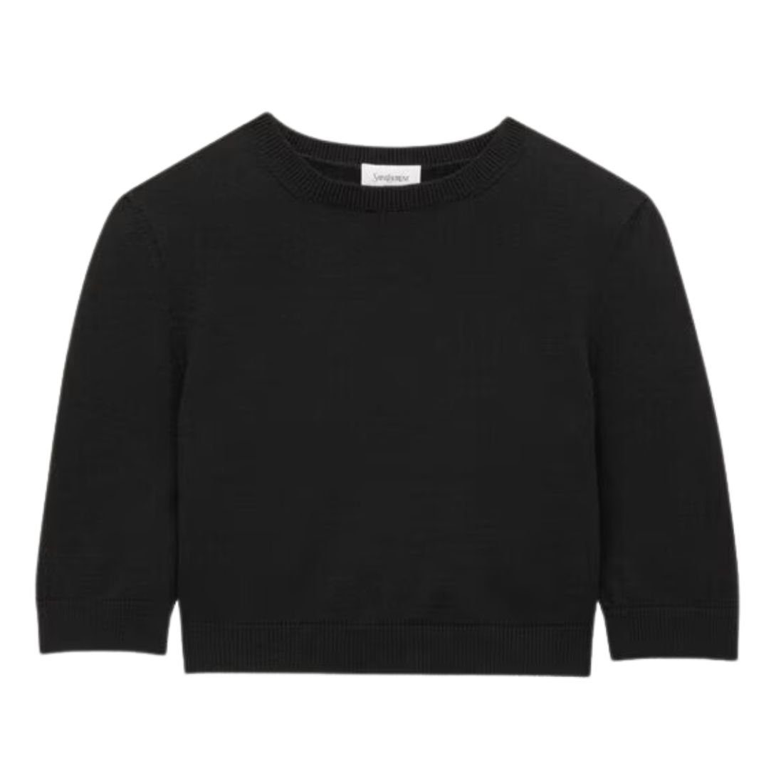 This knitted Saint Laurent Crop Top in Wool is crafted from 100% certified wool, offering both comfort and quality. With its crewneck and ½-length short sleeves, it combines a classic silhouette with modern styling.