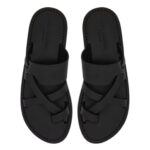 The sandals feature a thick leather arch band for secure support and crossed toehold straps for added style and comfort. The simple yet elegant design makes them versatile for both casual and relaxed settings.