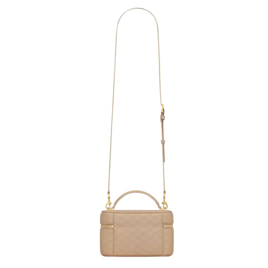 This sophisticated vanity bag showcases timeless elegance with its diamond-quilted overstitching and iconic CASSANDRE decoration. Designed for versatility, it offers multiple carry options and refined functionality.