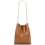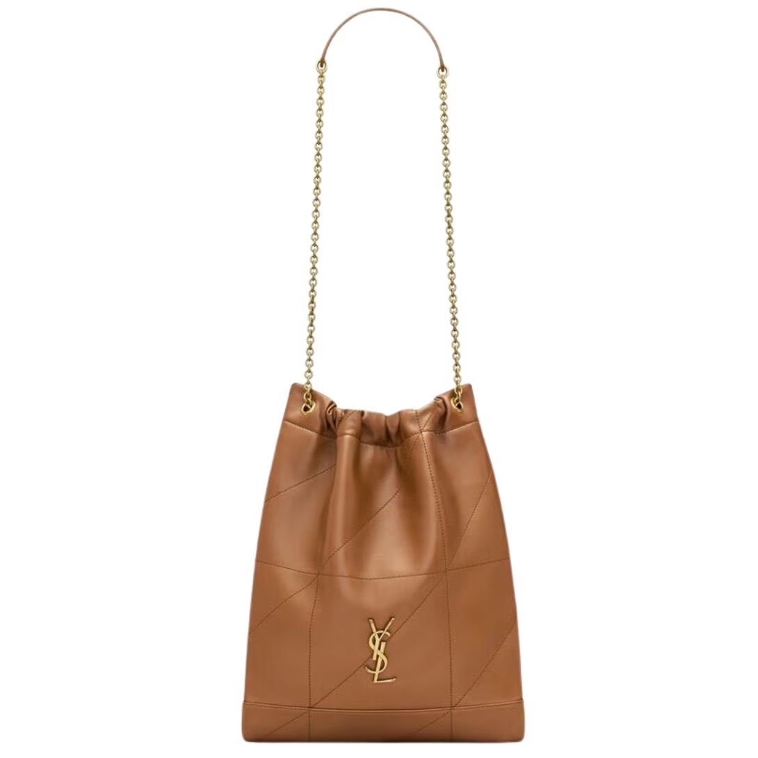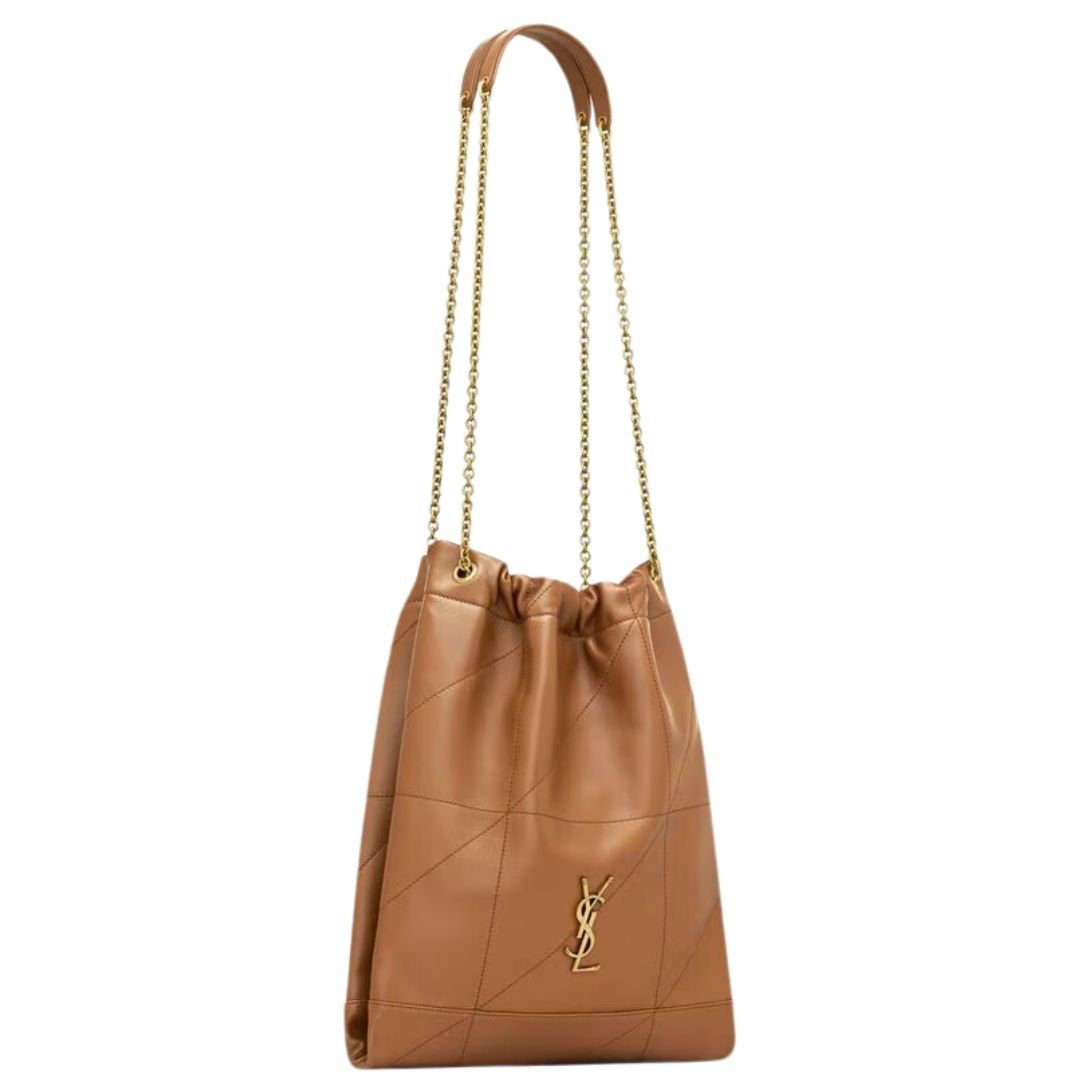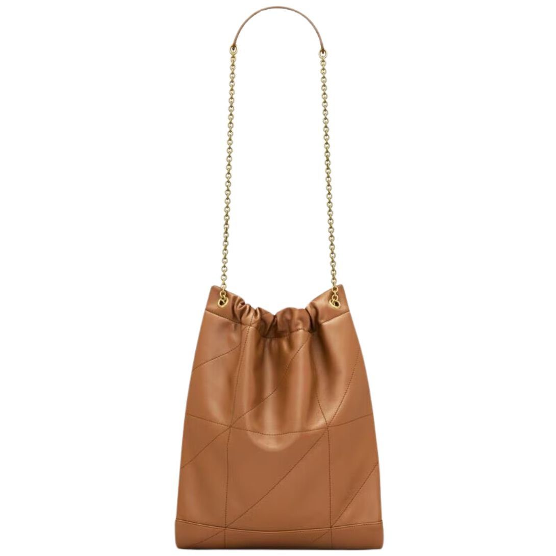 The pouch version of the Jamie is crafted in supple nappa leather with Carré Rive Gauche topstitching, making it both elegant and durable. This lightweight and spacious bag features a drawstring chain that allows for customizable carrying options, while the removable zip pouch offers additional functionality.