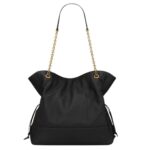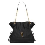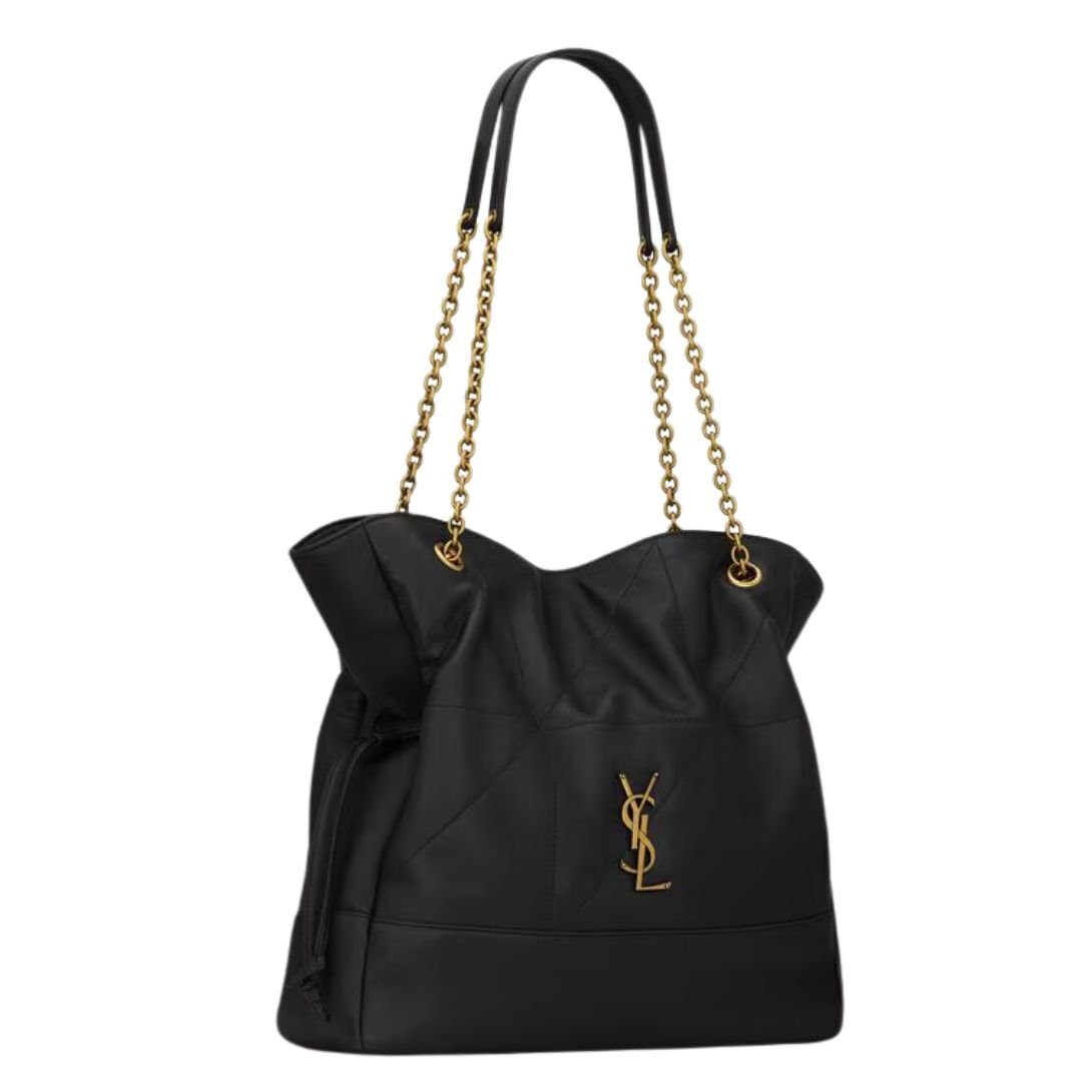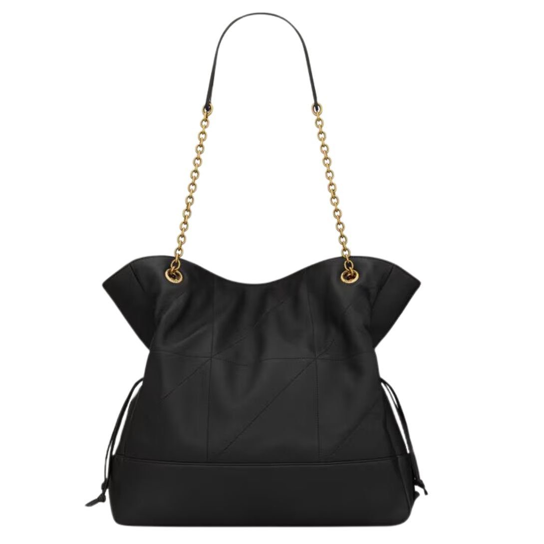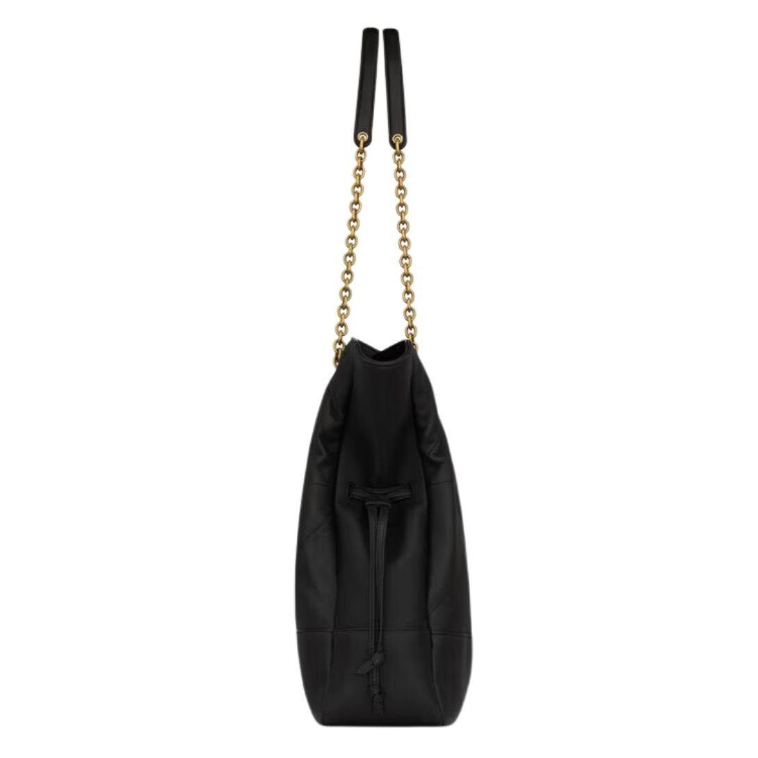 This shopping version of the Jamie is crafted from supple nappa leather and features distinctive design elements such as the Cassandre and Carré Rive Gauche topstitching. A lightweight yet spacious bag, it combines both style and functionality. The bag comes with a chain strap and a removable zip pouch, making it versatile for everyday use. The design also includes drawstring ties that allow the sides to be cinched or expanded, offering a customizable silhouette.