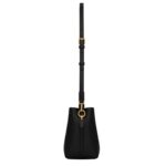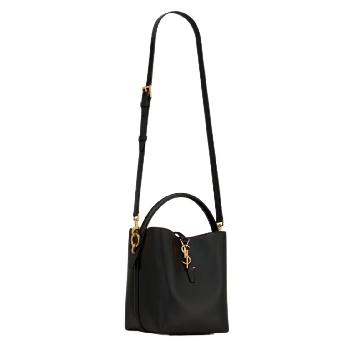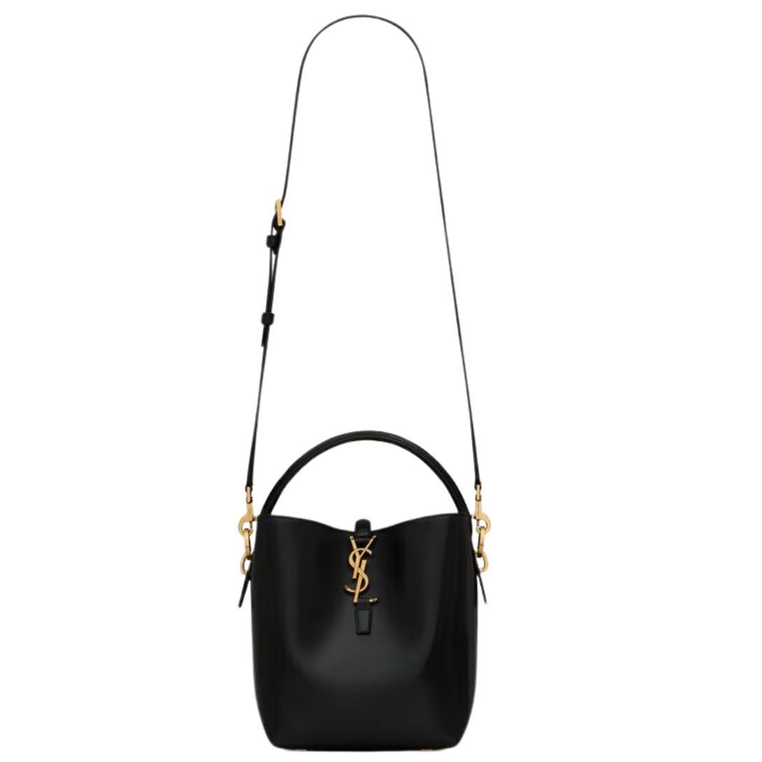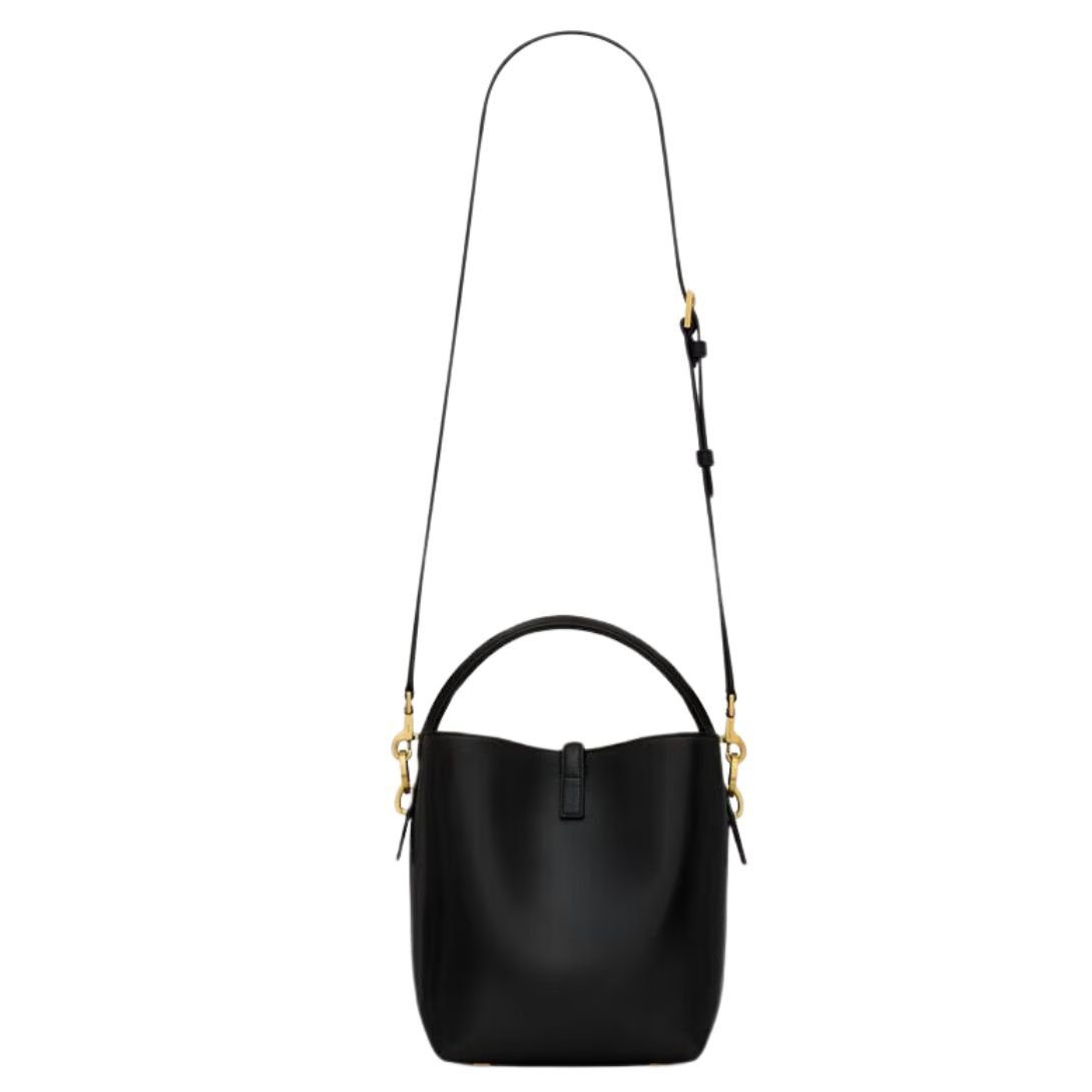 This elegant bucket bag is defined by its Cassandre hook closure, which adds both a signature touch and practical security. The bag features a top handle for a refined look and an adjustable, detachable shoulder strap for added flexibility. Its interior is lined with suede, providing a luxurious feel.