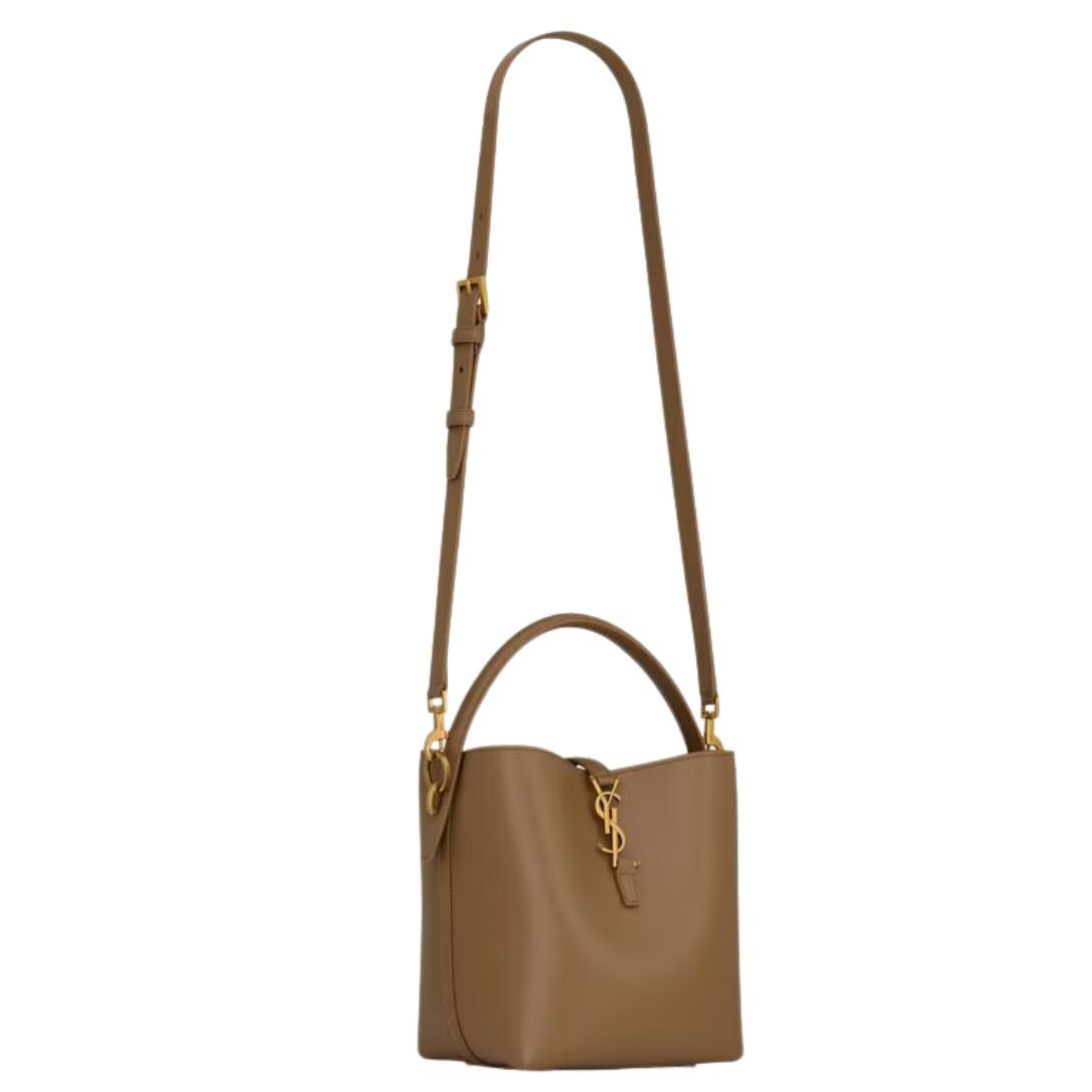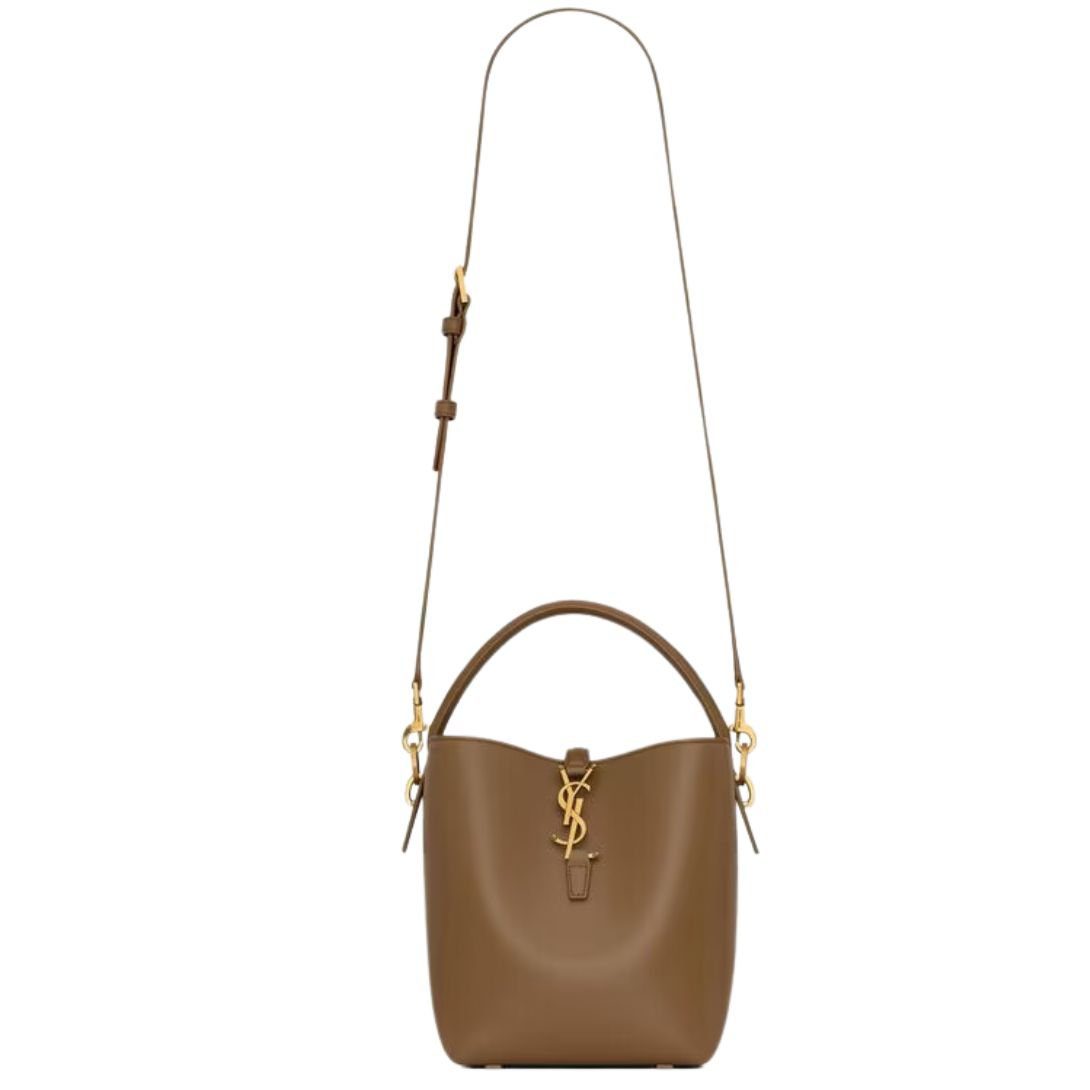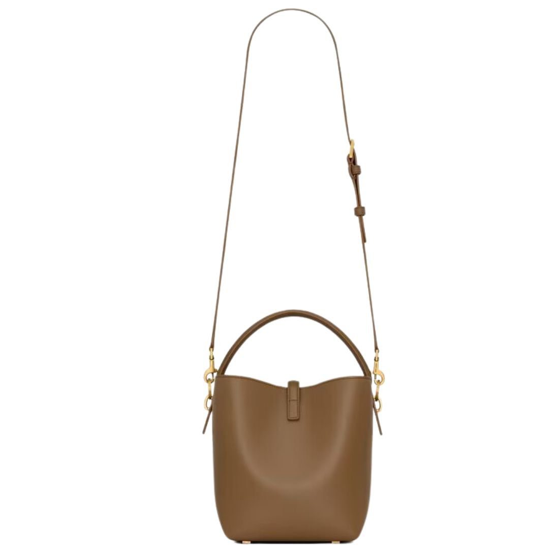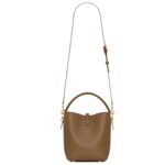 This bucket bag combines practicality with elegance, featuring the signature Cassandre hook closure. The bag is equipped with a top handle and an adjustable and detachable shoulder strap, offering versatile carry options for any occasion. The interior is lined with soft suede for a luxurious touch.