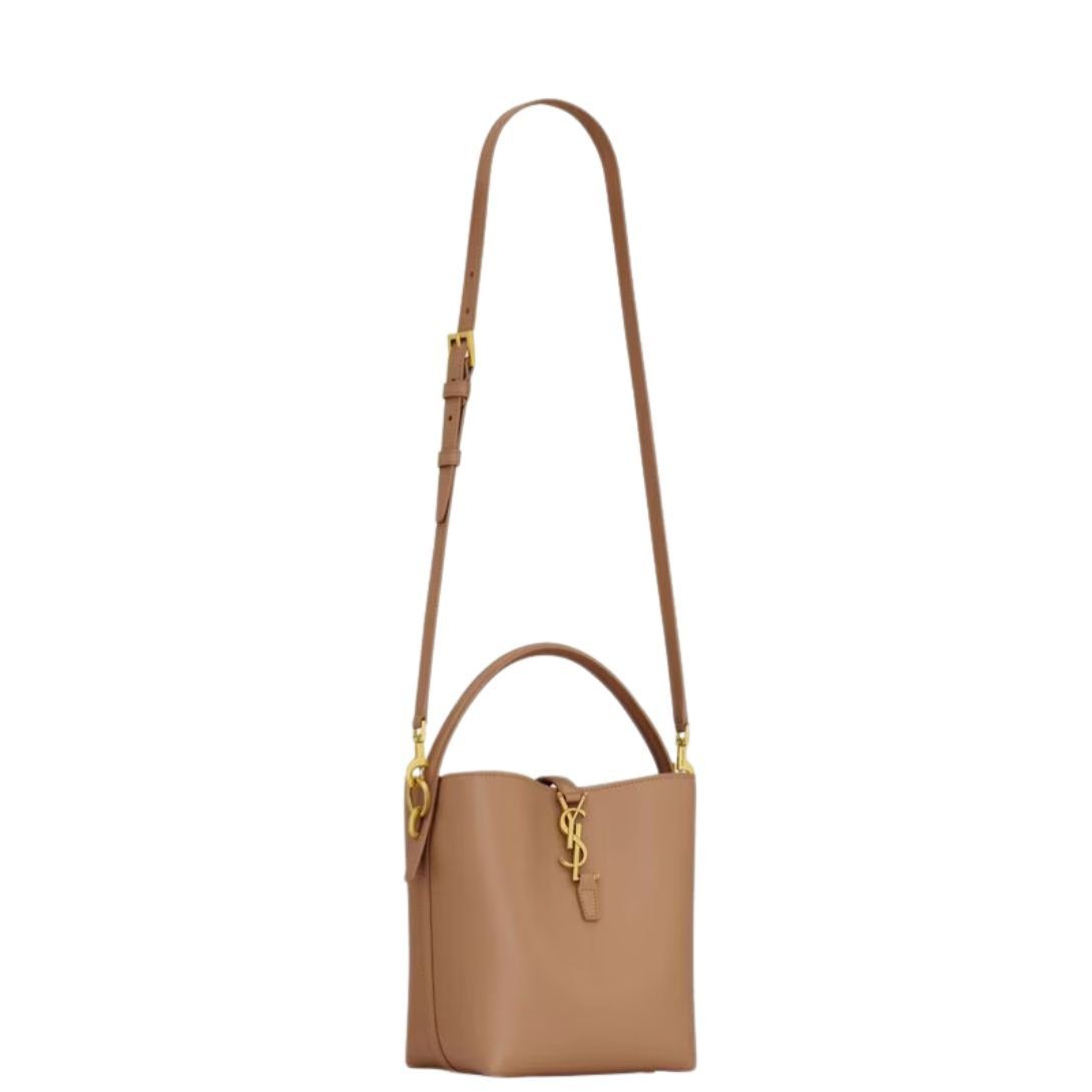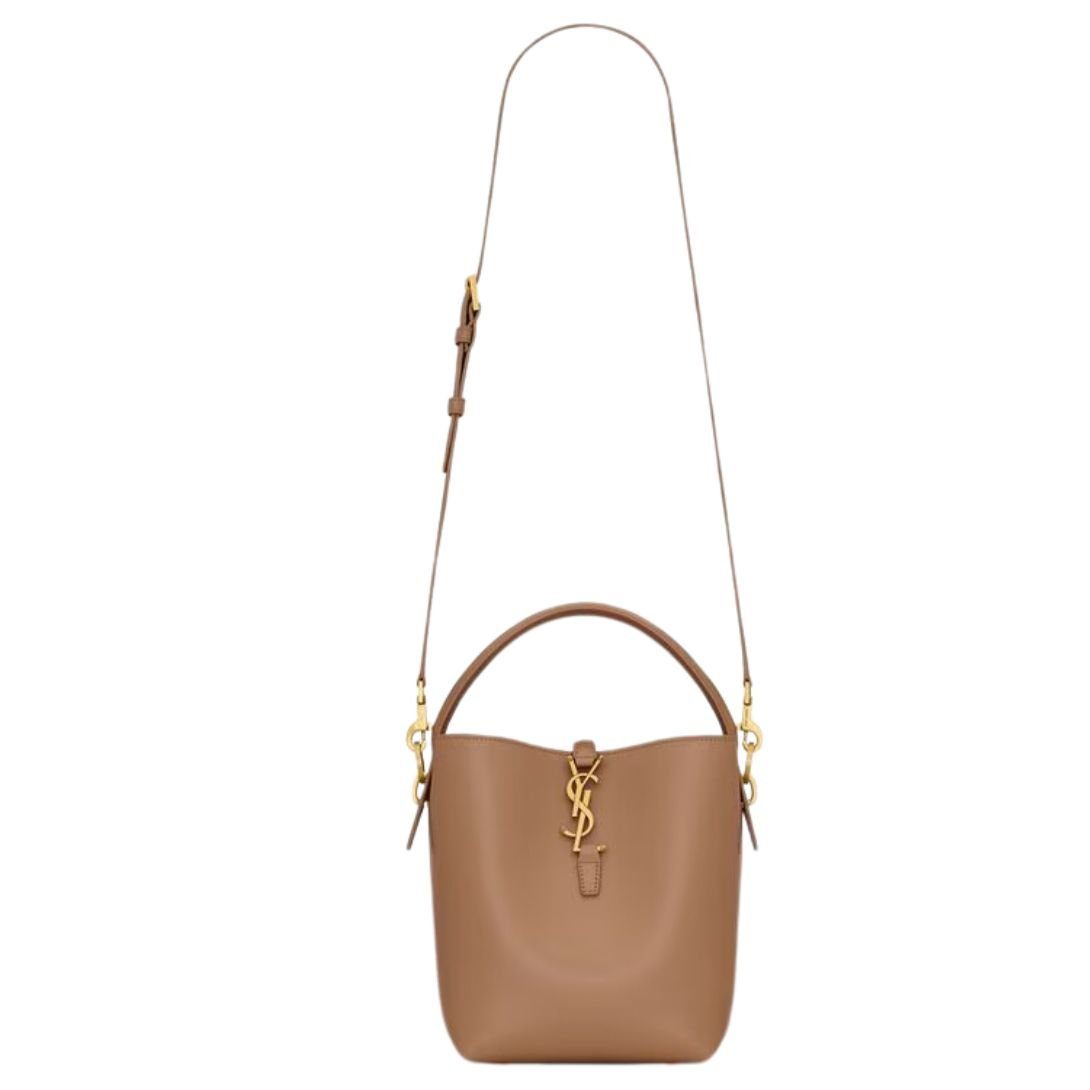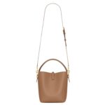 The bucket bag showcases the distinctive metal Cassandre hook closure, known for its sleek appearance and secure fastening. It is equipped with a top handle for easy hand carry, as well as an adjustable and detachable shoulder strap for crossbody wear. This functionality ensures that the bag can be styled in multiple ways.