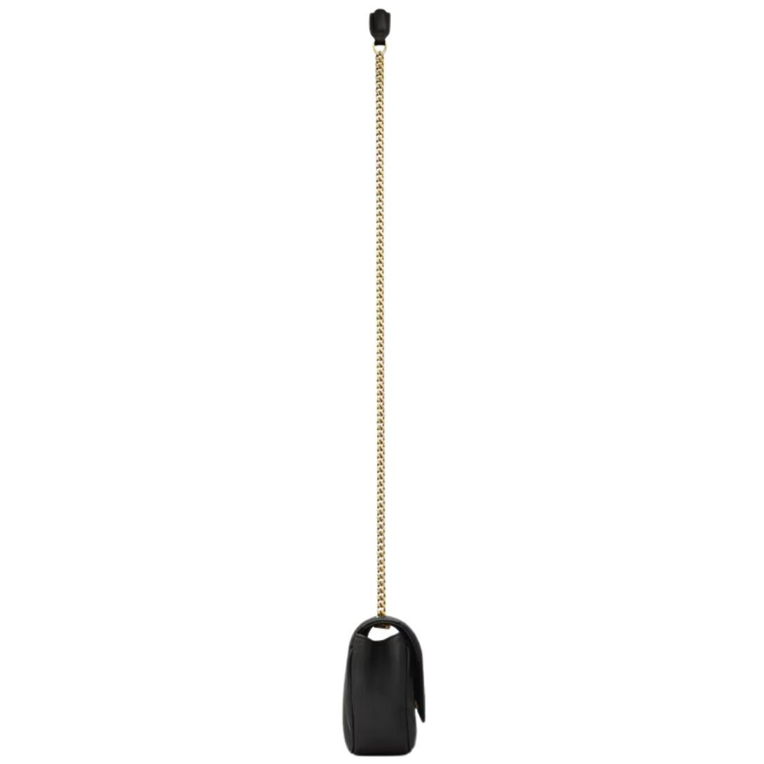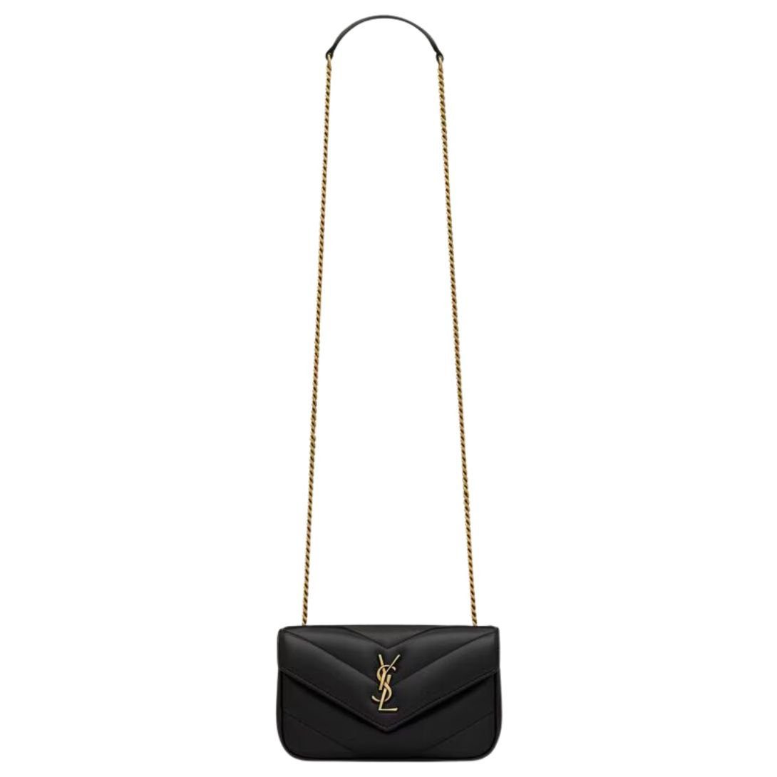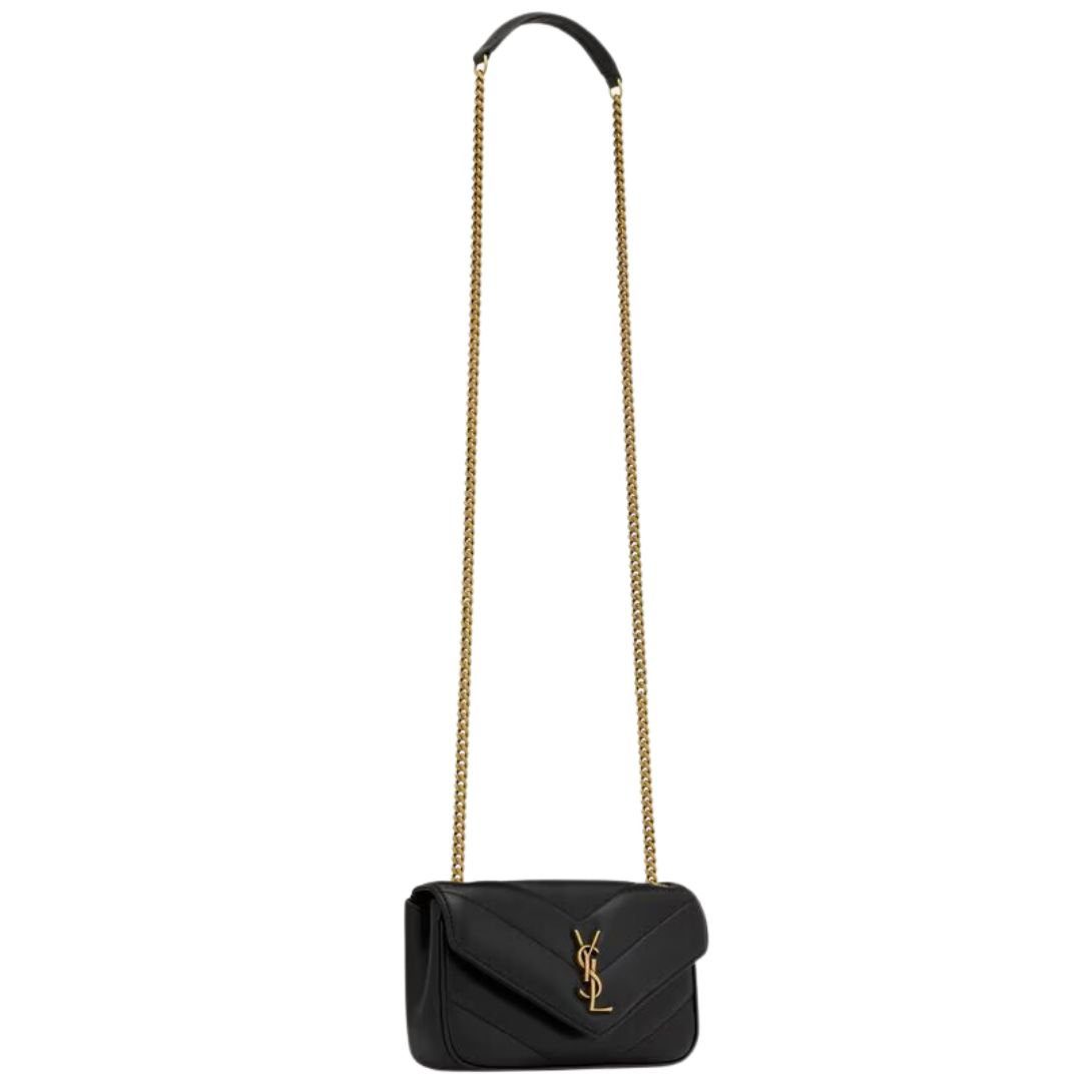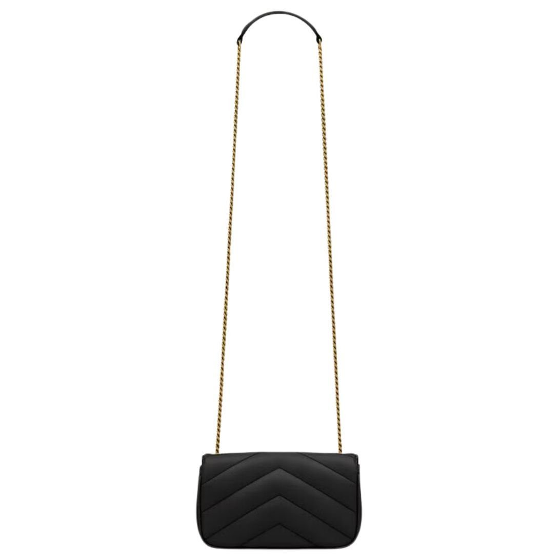 The mini version of the LOULOU chain bag is crafted from luxurious lambskin and adorned with the iconic chevron-quilted topstitching. Its compact size and lightweight design make it perfect for day-to-night wear. The bag features a removable leather pouch and a leather and chain strap, making it ideal for crossbody carry.