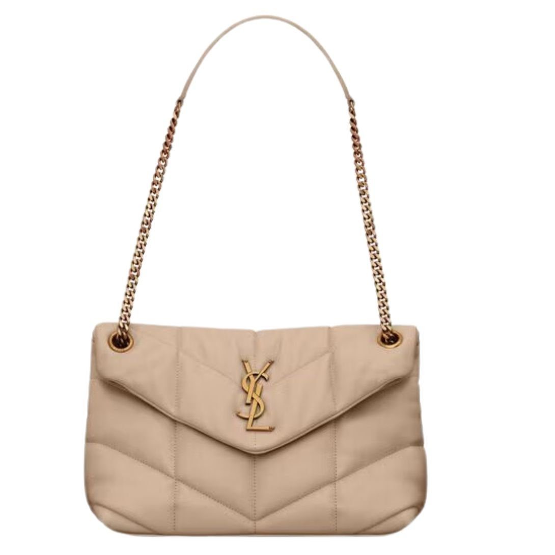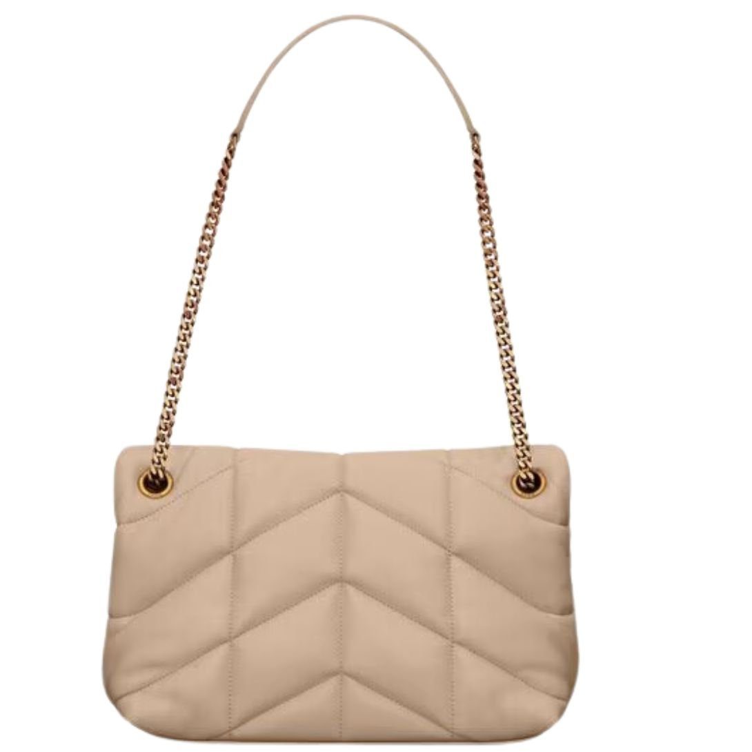 The Iconic Loulou in a puffer version with chevron quilt over stitching offers a bold, contemporary aesthetic. It features a sliding chain strap for shoulder or crossbody wear, adding both style and versatility to your wardrobe.