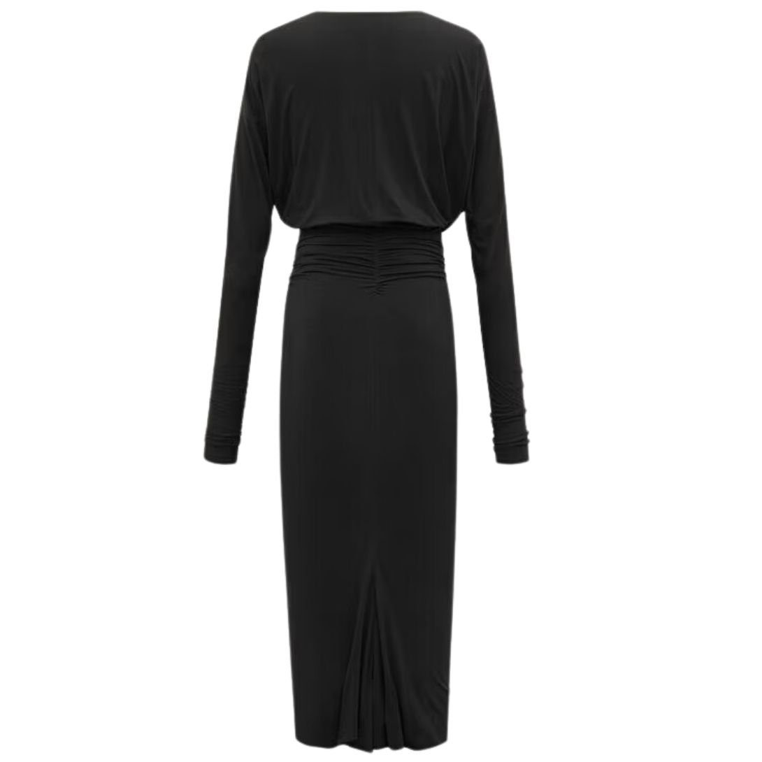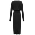 The Gathered Dolman Sleeves Provide a Voluminous, Relaxed Shape that Balances the Fitted Silhouette. Gathered Sides Enhance the Dress’s Fluidity and Movement, Offering a Flattering and Contemporary Touch.