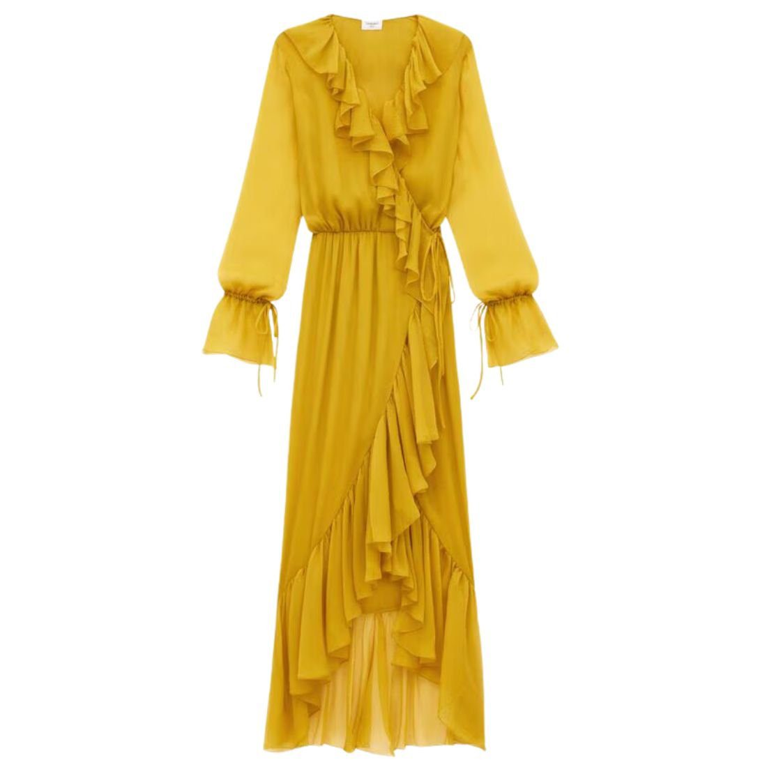 Proudly made in France, this semi-sheer long wrap dress combines modern sophistication with timeless charm, making it an exquisite addition to your wardrobe for any occasion.