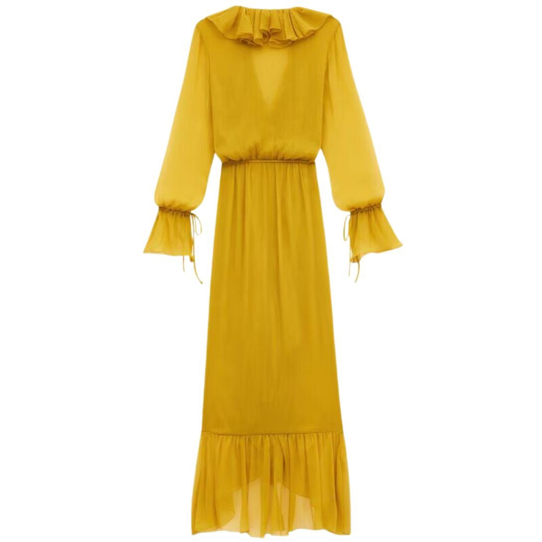 This elegant long wrap Saint Laurent Ruffled Dress in Silk Crepon Muslin IS Crafted from 100% Silk, Offering a Semi-Sheer Texture that Is Both Lightweight and Breathable. the Luxurious Fabric Ensures a Graceful Drape, Perfect for Creating a Sophisticated and Feminine Look.